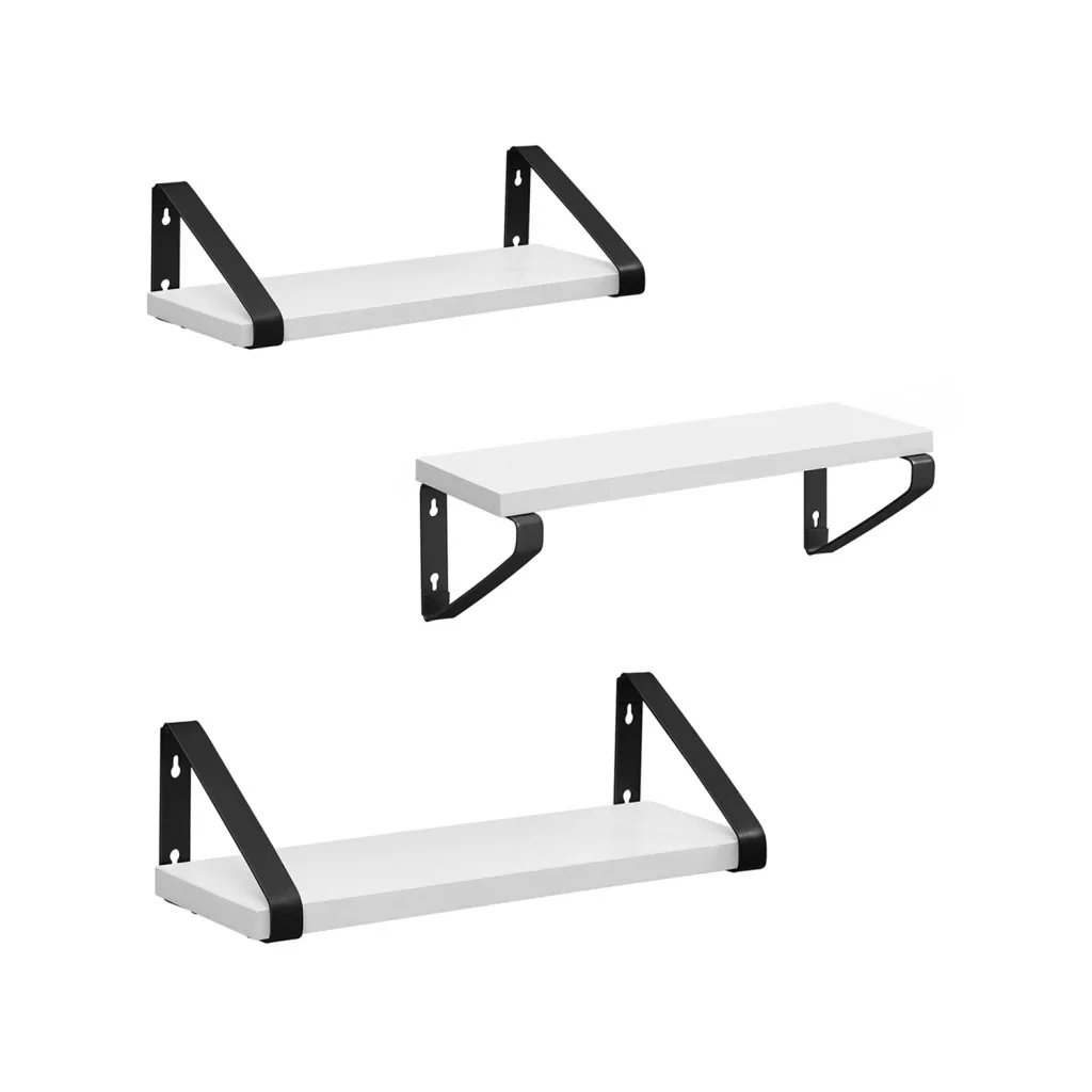 Modern, ipari stílusú 3 részes fali polc szett fehér polclapokkal és fekete fém tartókonzolokkal, amely tökéletes dekorációs és tárolási megoldást nyújt otthonában.