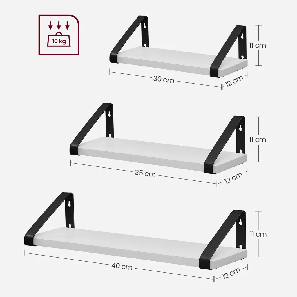 Ez a három különböző méretű lebegő polc tökéletes egyensúlyt teremt a funkcionalitás és az esztétika között. A fehér polclapok és fekete fém tartókonzolok modern ipari designt kölcsönöznek, miközben praktikus tárolóhelyet biztosítanak könyveknek, dekorációs tárgyaknak vagy mindennapi használati eszközöknek.