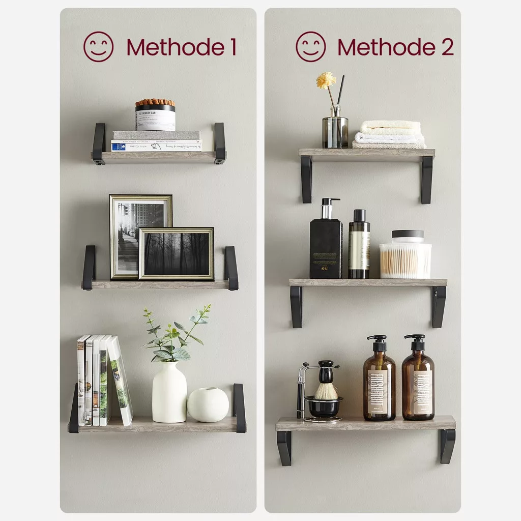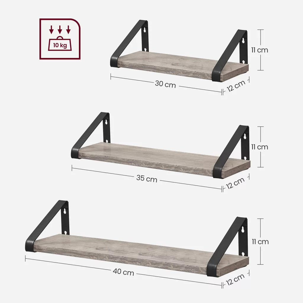 Stílusos, 3 részes lebegő polc szett ipari dizájnnal, tökéletes dekorációs és tárolási megoldás otthonába. A szürke polcok és fekete fém tartókonzolok modern-vintage hangulatot teremtenek.