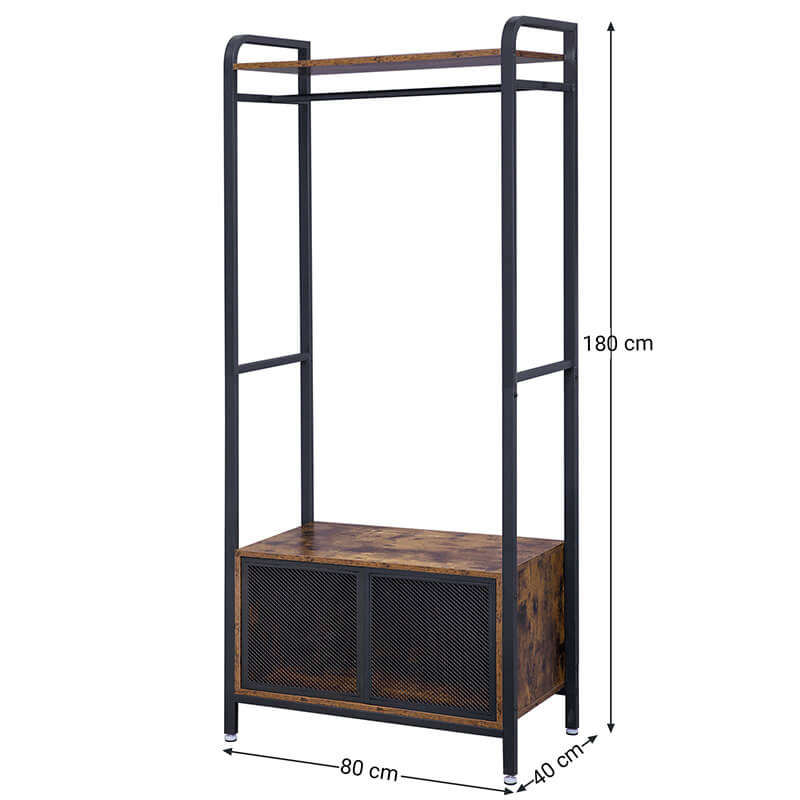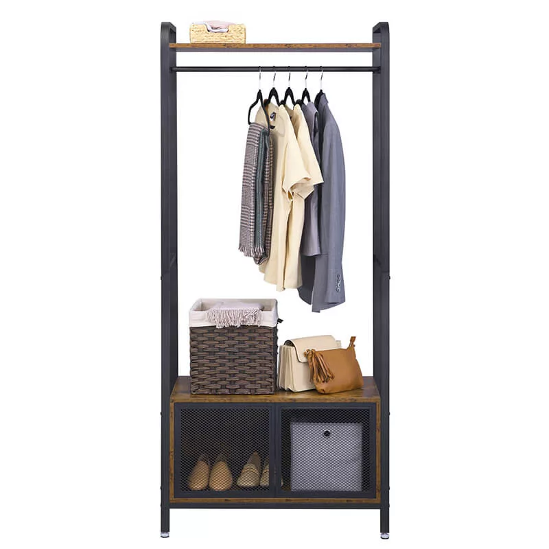 Modern ipari stílusú nyitott gardrób szekrény acél vázzal és rusztikus barna faborítással, praktikus tárolási megoldásokkal az előszobába vagy hálószobába.
