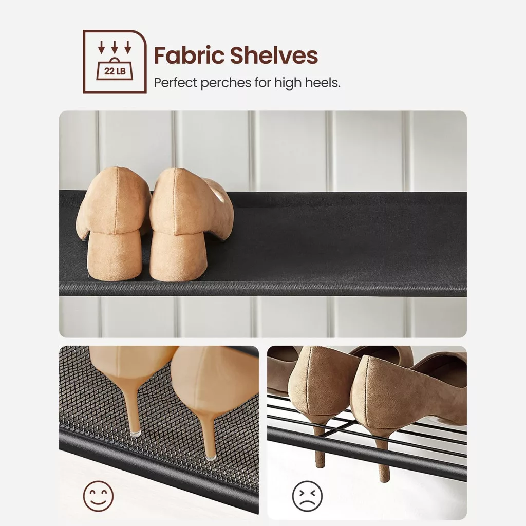 A két polcos cipőtároló Oxford szövet borítással ideális megoldást kínál különböző típusú lábbelik tárolására, míg az ülőpad kényelmes helyet biztosít a cipőfelvételhez. Az állítható lábaknak köszönhetően stabilan áll egyenetlen padlón is.