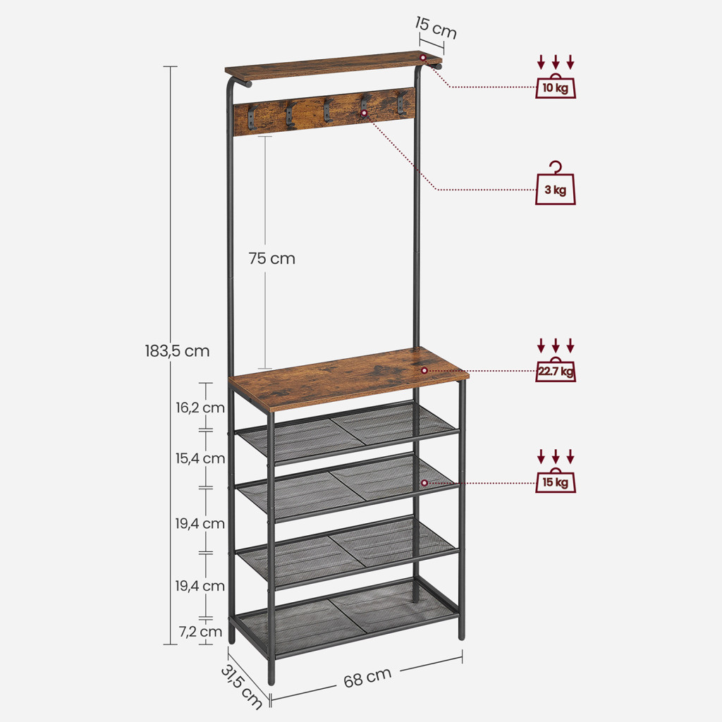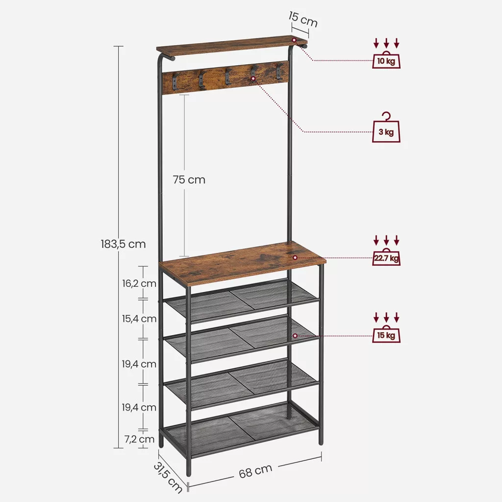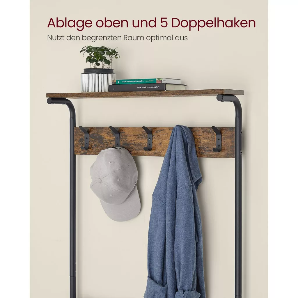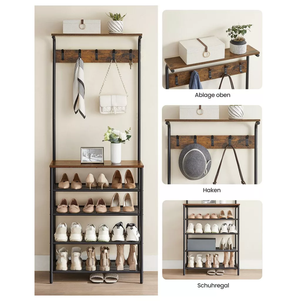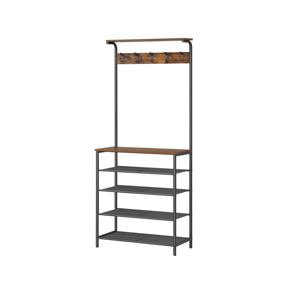 Többfunkciós előszobai állófogas 5 cipőtároló polccal és 5 dupla akasztóval, amely ötvözi az ipari stílust a praktikummal. Rusztikus barna és matt fekete színkombinációja tökéletesen illeszkedik a modern otthonokba.