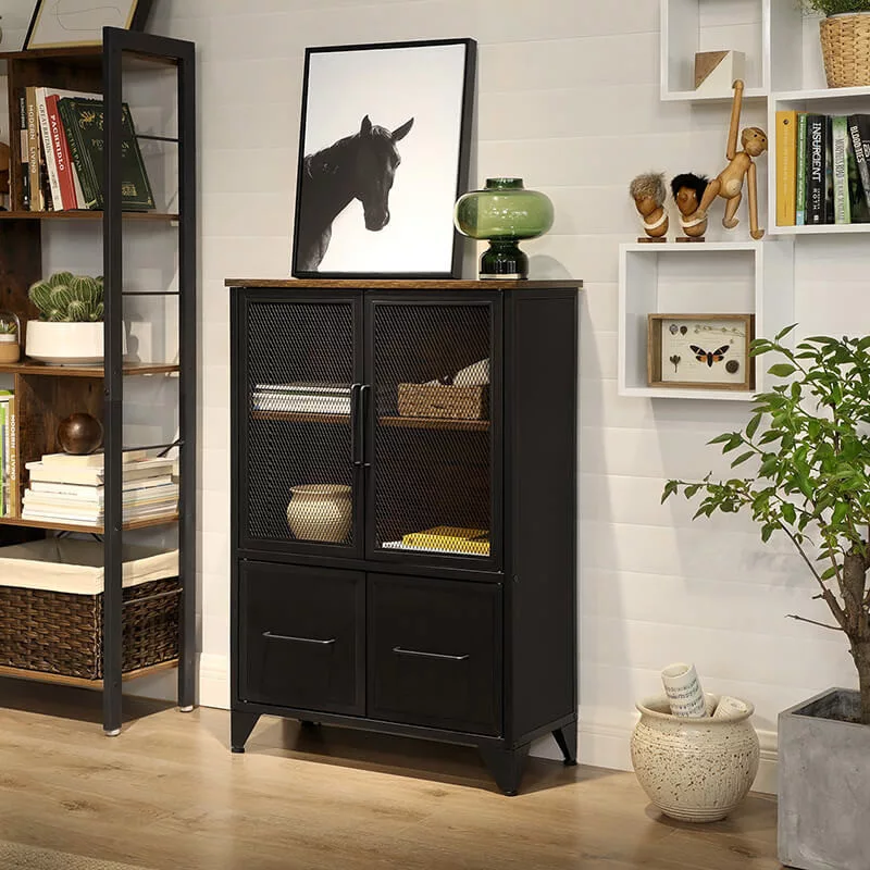 Ez a VASAGLE tárolószekrény tökéletesen ötvözi az ipari dizájnt a funkcionalitással. A rusztikus barna fafelületek és a matt fekete acél váz elegáns kontrasztot alkotnak, míg a rácsos ajtók részben láthatóvá teszik a tárolt dolgokat, így dekoratív megjelenést kölcsönöznek.