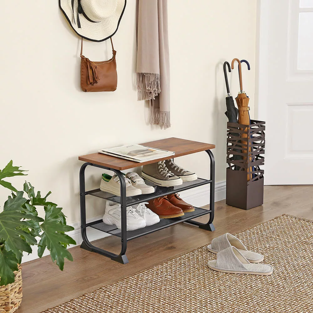 Ez a VASAGLE cipőtároló pad ötvözi a praktikumot és az esztétikumot. A rusztikus barna felület és az ívelt acélváz harmonikus összhangot teremt, miközben két hálós polca akár 6 pár cipő tárolására is alkalmas. A pad teteje dekorációs tárgyak vagy táskák elhelyezésére is tökéletes.