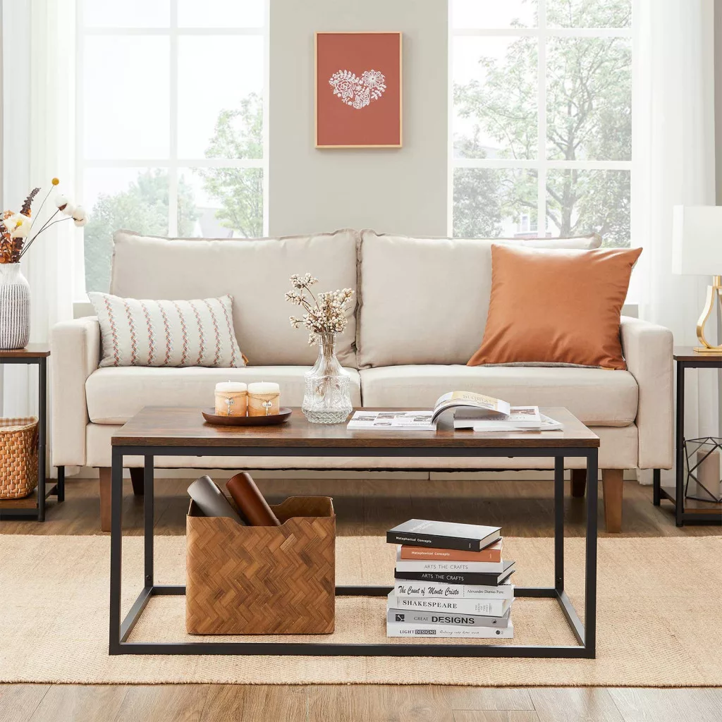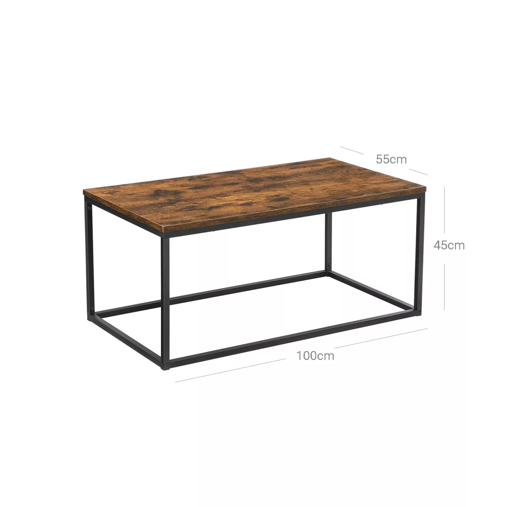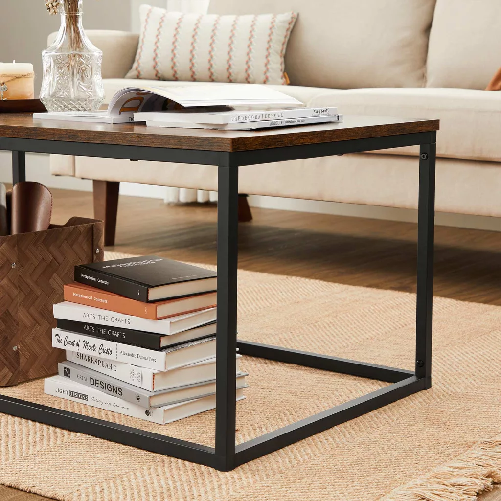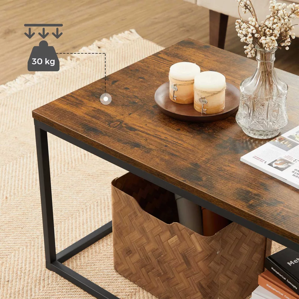 Ez a VASAGLE dohányzóasztal a minimalista design és a funkcionalitás tökéletes kombinációja. A rusztikus barna asztallap és a fekete acélváz időtlen ipari megjelenést kölcsönöz, miközben a nyitott kialakítás extra tárolóhelyet biztosít könyveknek, magazinoknak vagy dekorációs elemeknek.