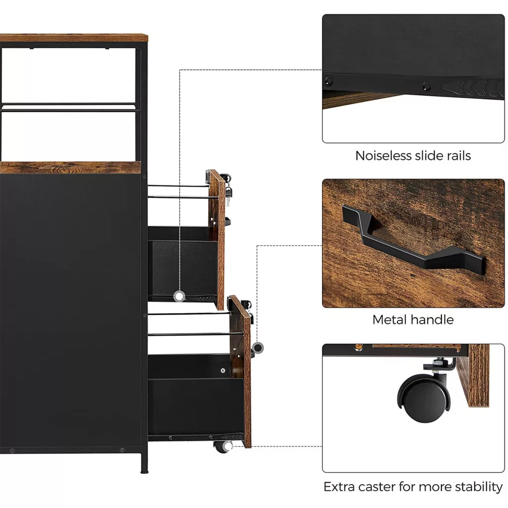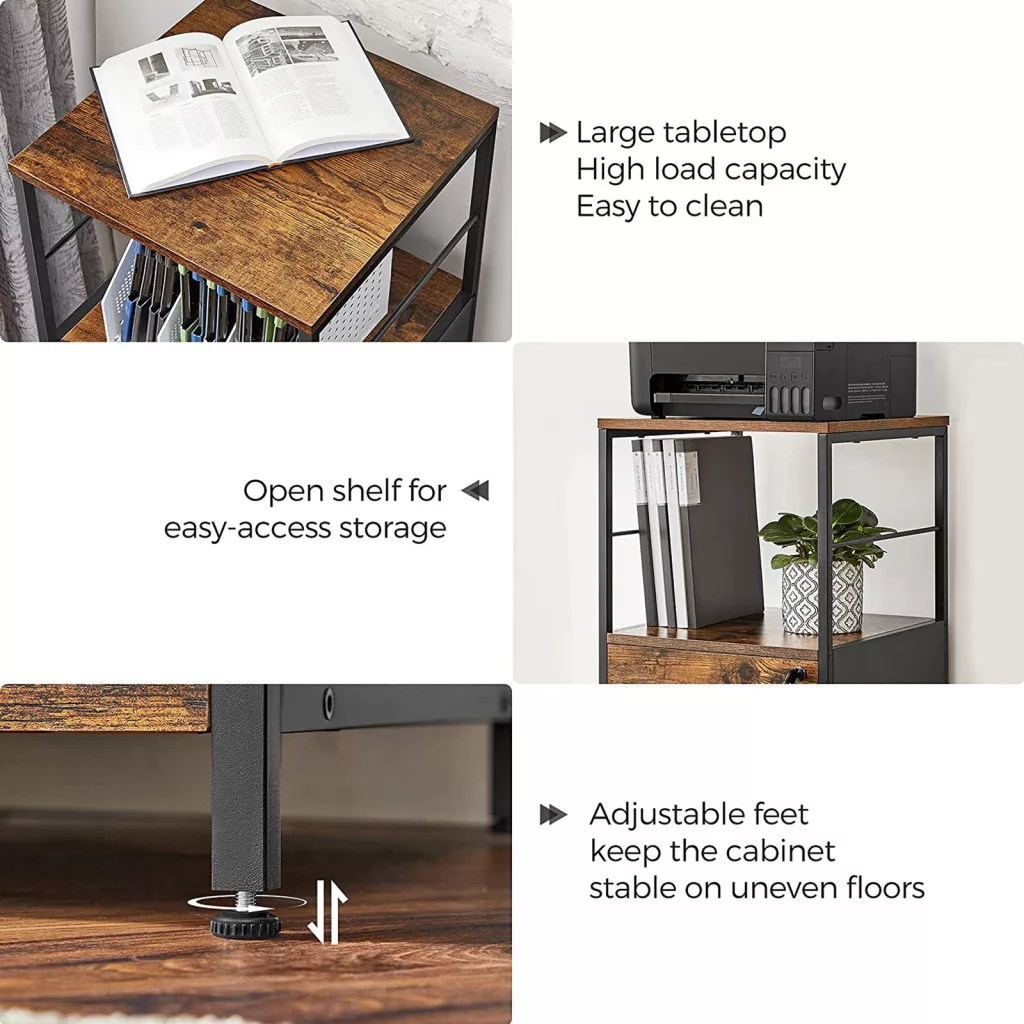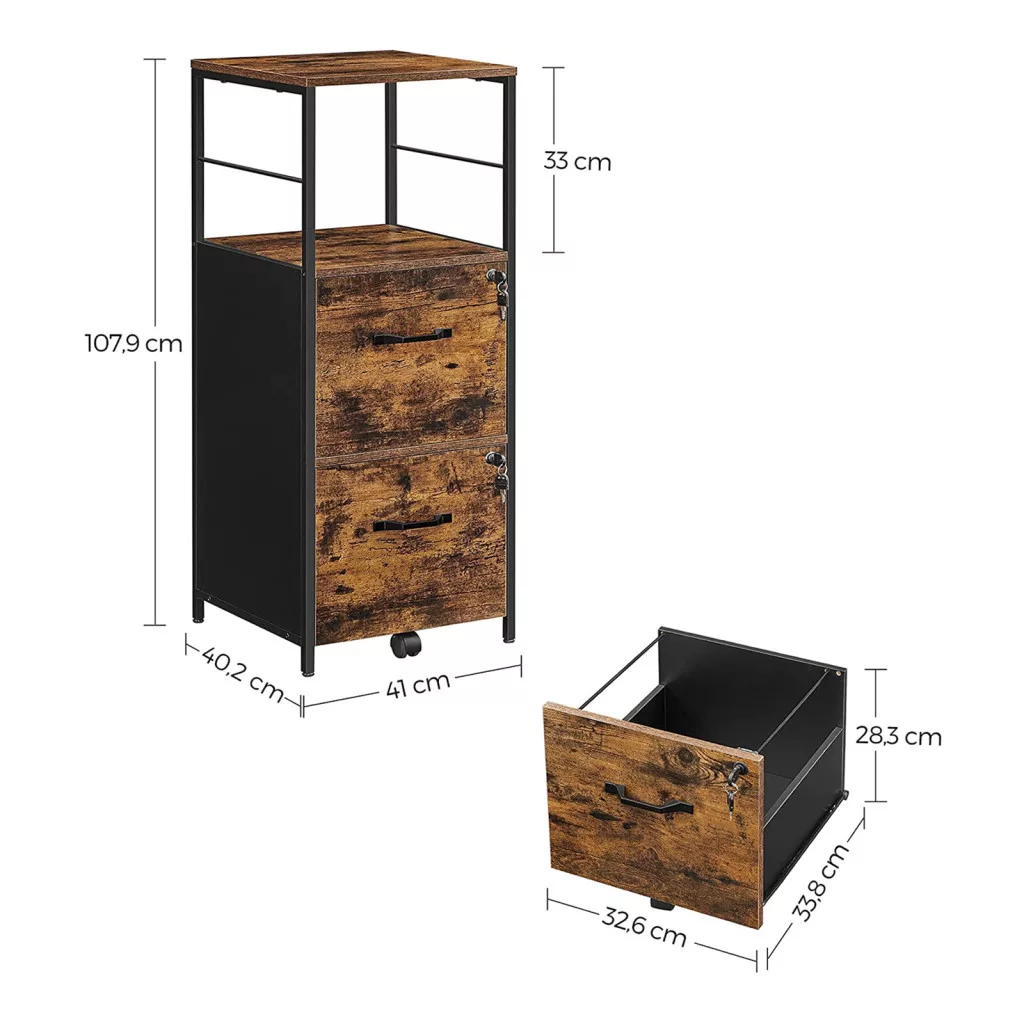 Ez a VASAGLE irattartó szekrény ötvözi a funkcionalitást és az ipari stílust. A két tágas fiók könnyedén befogadja az A4-es és letter méretű dokumentumokat, míg a 33 cm magas nyitott polc ideális helyet biztosít a gyakran használt irodai kellékeknek vagy nyomtatónak.