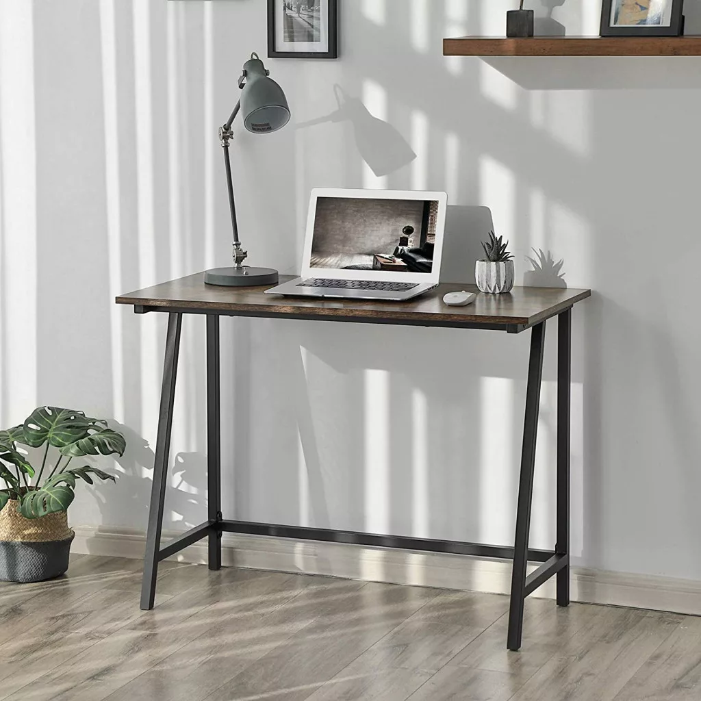 Modern ipari stílusú íróasztal rusztikus barna asztallap és fekete acélváz kombinációjával, tökéletes választás otthoni irodába vagy dolgozószobába.