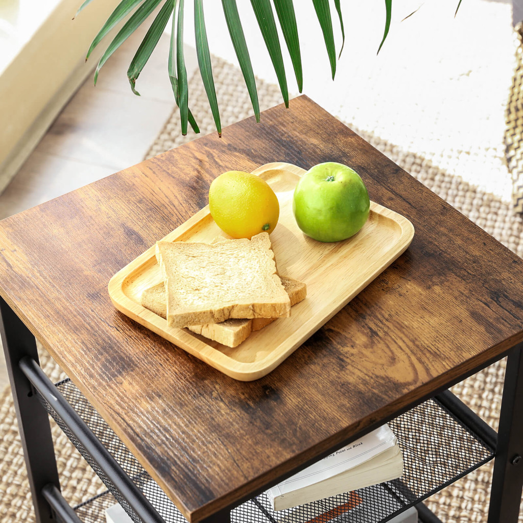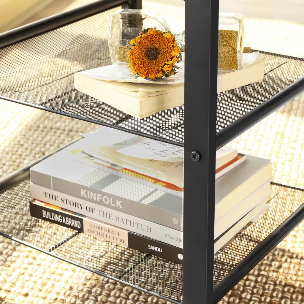 Modern ipari stílusú kisasztal két állítható hálós polccal, amely tökéletes kiegészítő a nappaliba vagy hálószobába. Stabil acélváz és rusztikus barna asztallap jellemzi.