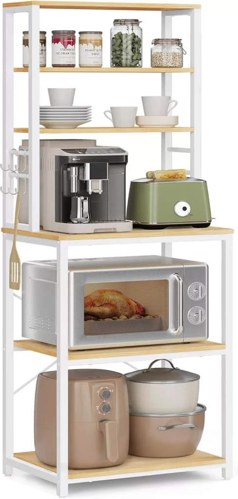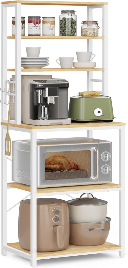 Sokoldalú konyhai tárolóállvány 6 polccal és 6 akasztóval, amely tökéletes megoldást nyújt a konyhai eszközök és készülékek rendszerezett tárolására.