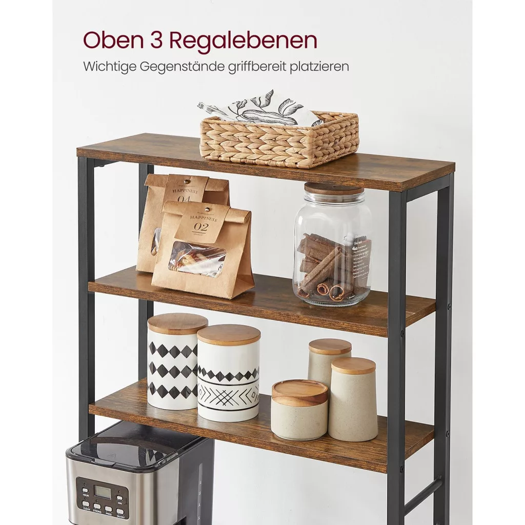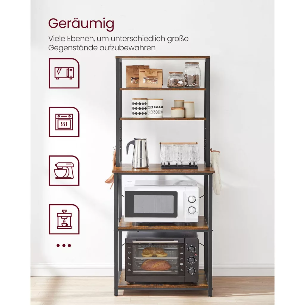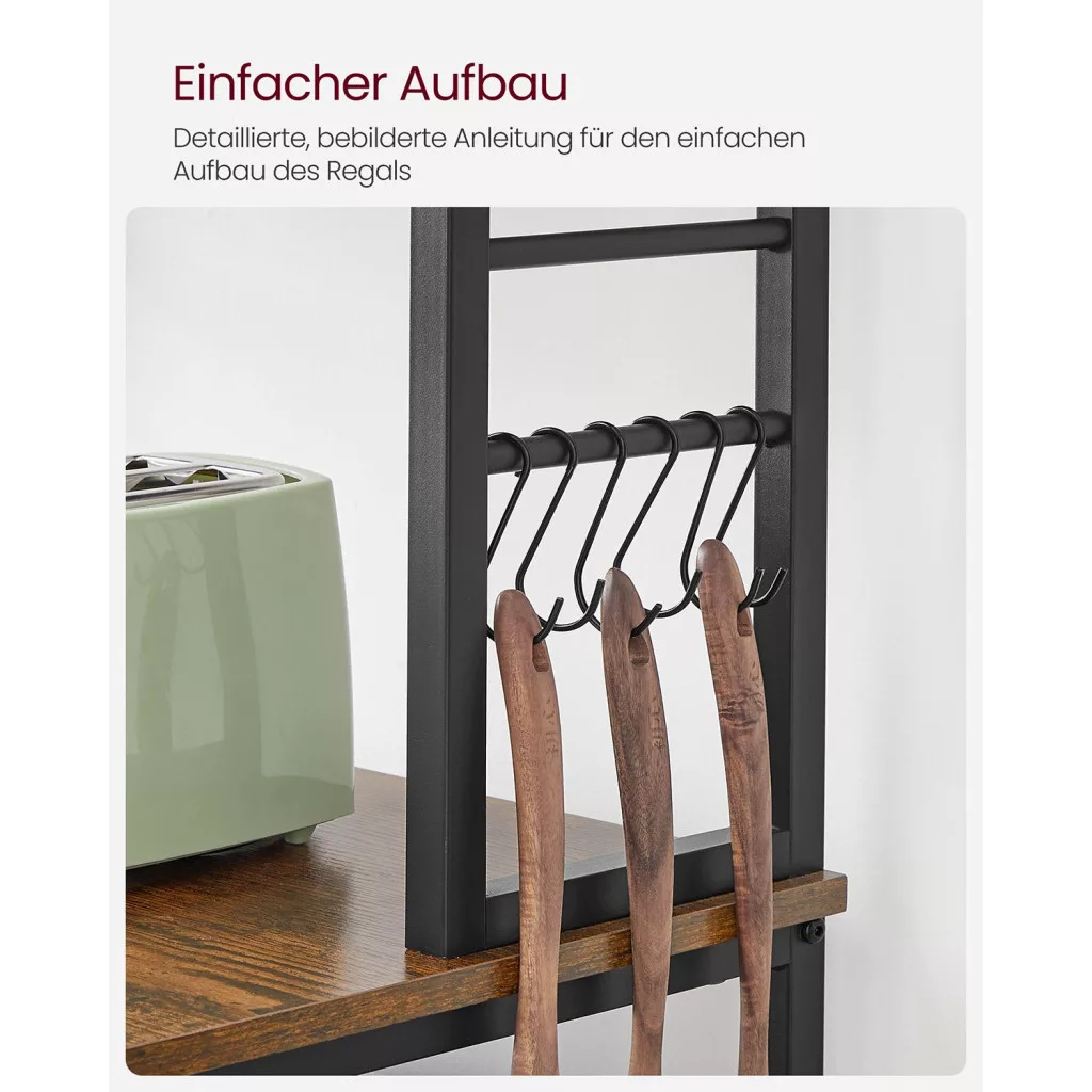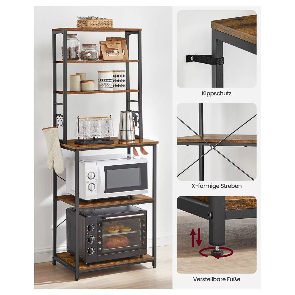 Sokoldalú konyhai állvány 6 polccal és 6 kampóval, amely tökéletes megoldást nyújt a mikrohullámú sütő, kávéfőző és egyéb konyhai eszközök tárolására. Ipari stílusú dizájn acél vázzal és vintage barna polcokkal.