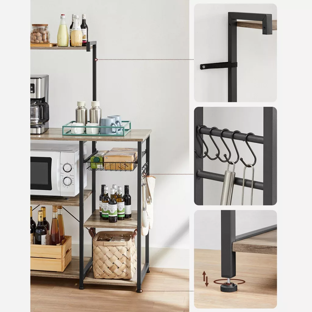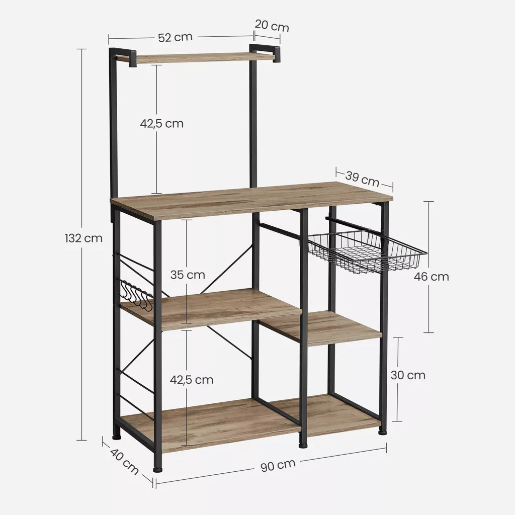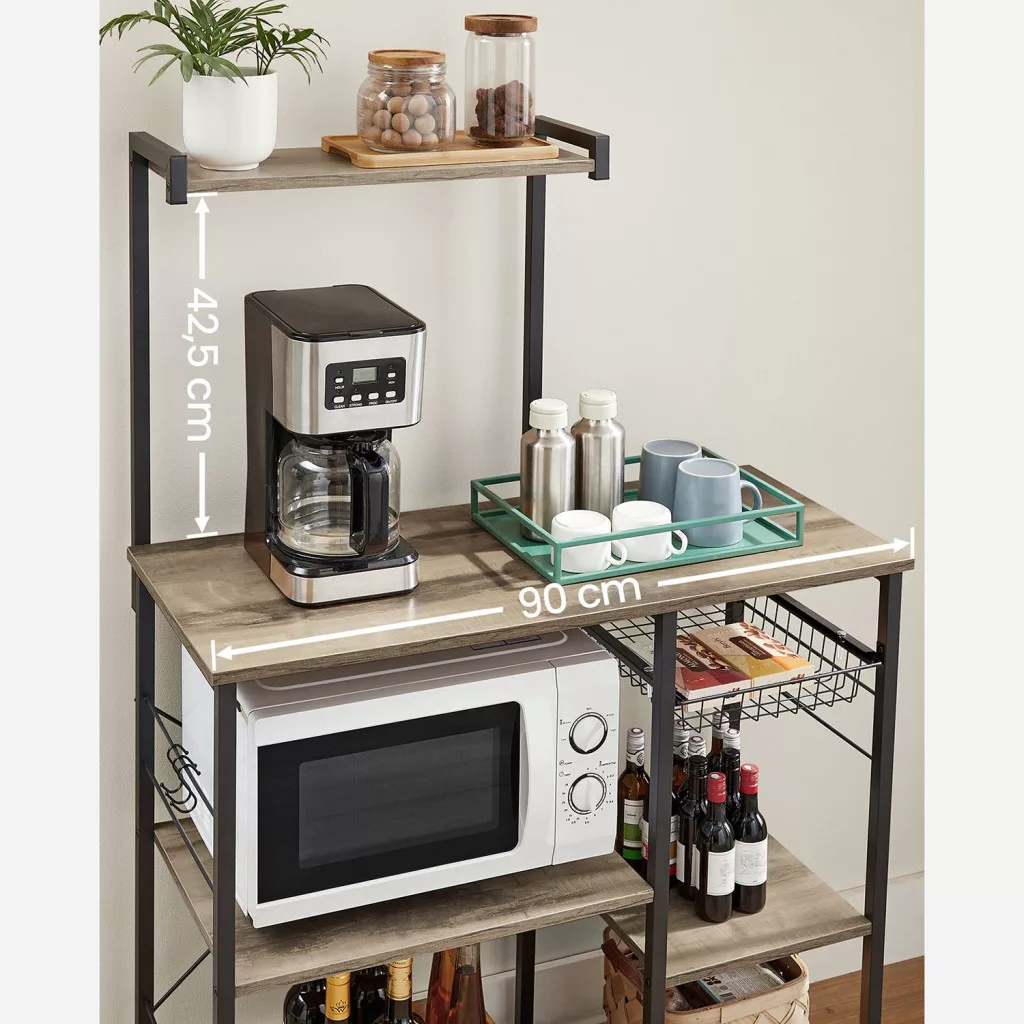 A többszintes kialakítás lehetővé teszi a mikrohullámú sütő, kávéfőző és egyéb konyhai eszközök praktikus elhelyezését. A beépített fém kosár és az S-kampók további tárolási lehetőséget kínálnak az edények és konyhai eszközök számára.