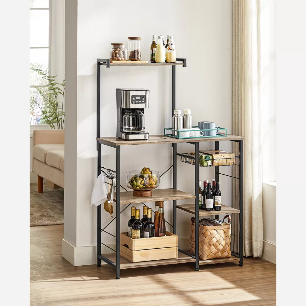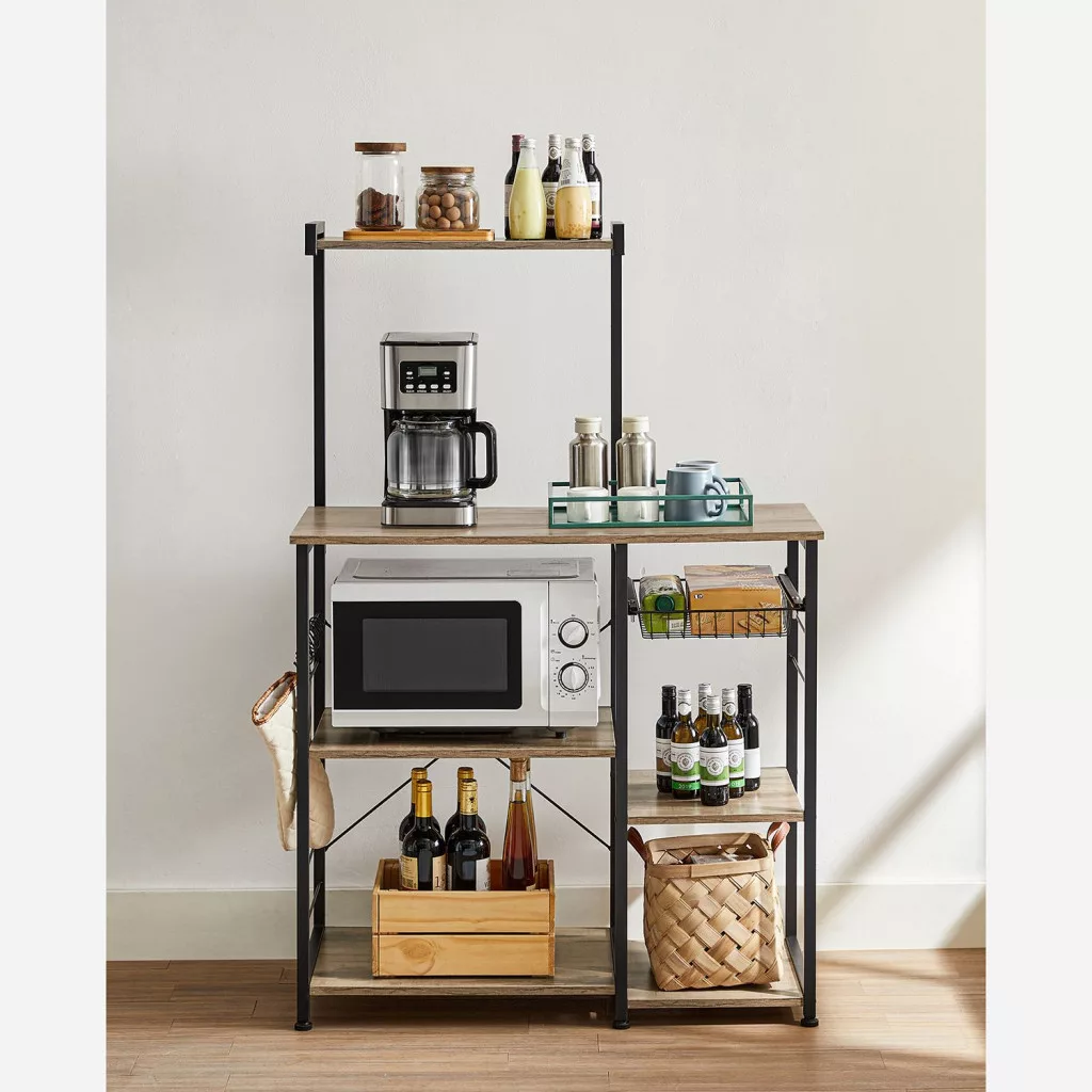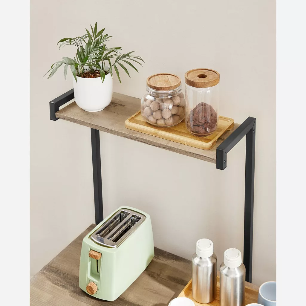 A többszintes kialakítás lehetővé teszi a mikrohullámú sütő, kávéfőző és egyéb konyhai eszközök praktikus elhelyezését. A beépített fém kosár és az S-kampók további tárolási lehetőséget kínálnak az edények és konyhai eszközök számára.