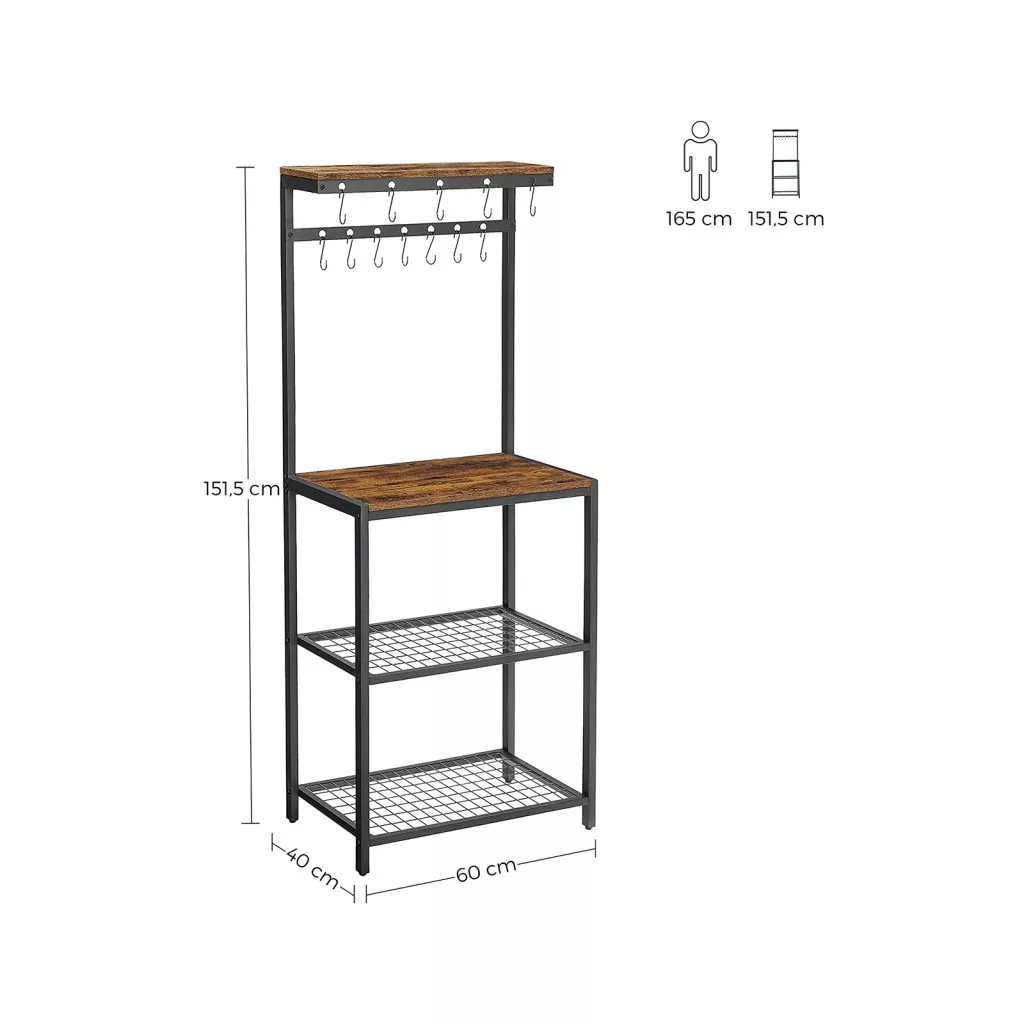 Ez az ipari stílusú konyhai állvány egyesíti a praktikumot és az esztétikumot. A rusztikus barna fa mintázatú polcok és a matt fekete acélváz tökéletes összhangot alkotnak, miközben a 151,5 cm magas szerkezet optimálisan kihasználja a függőleges teret.