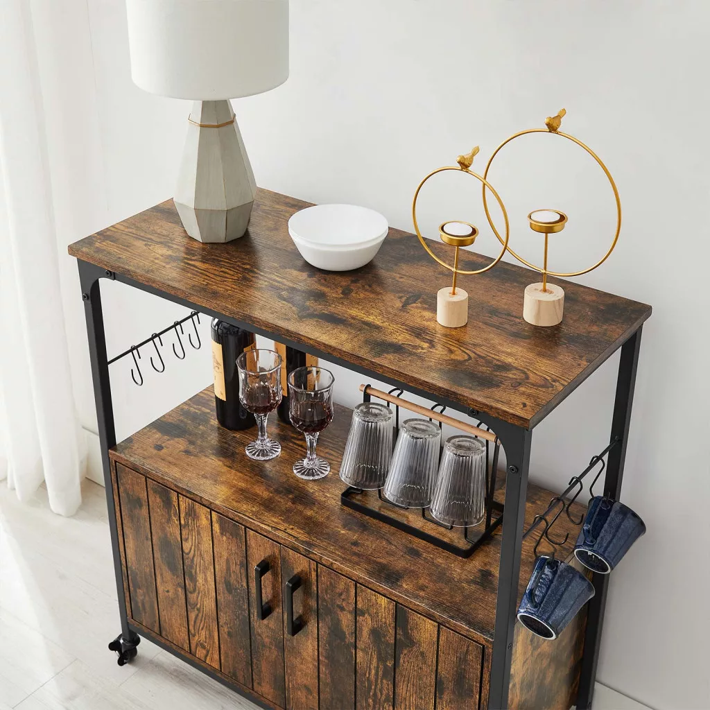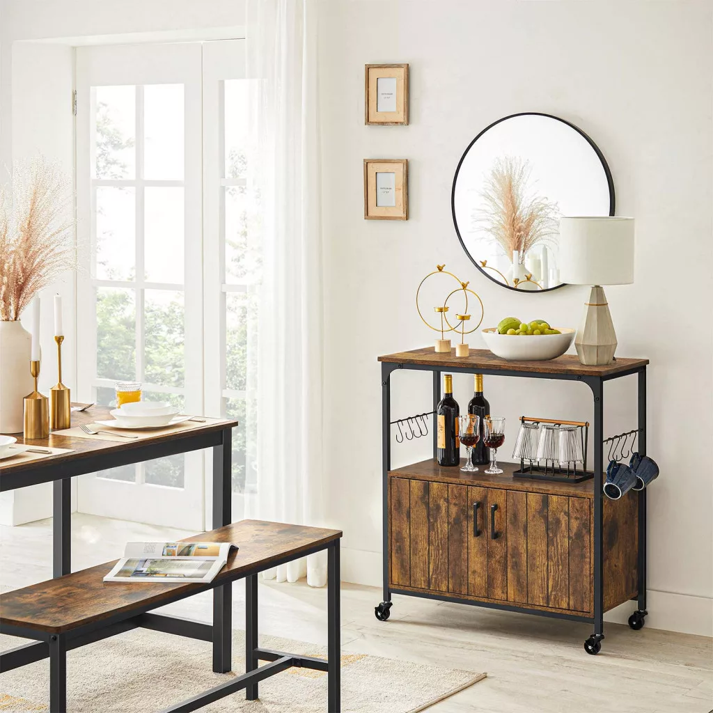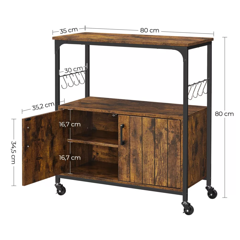 Sokoldalú konyhai tárolószekrény ipari stílusban, mely ötvözi a rusztikus barna fát és a fekete acél elemeket. Görgőkkel és 8 akasztóval a maximális funkcionalitásért.