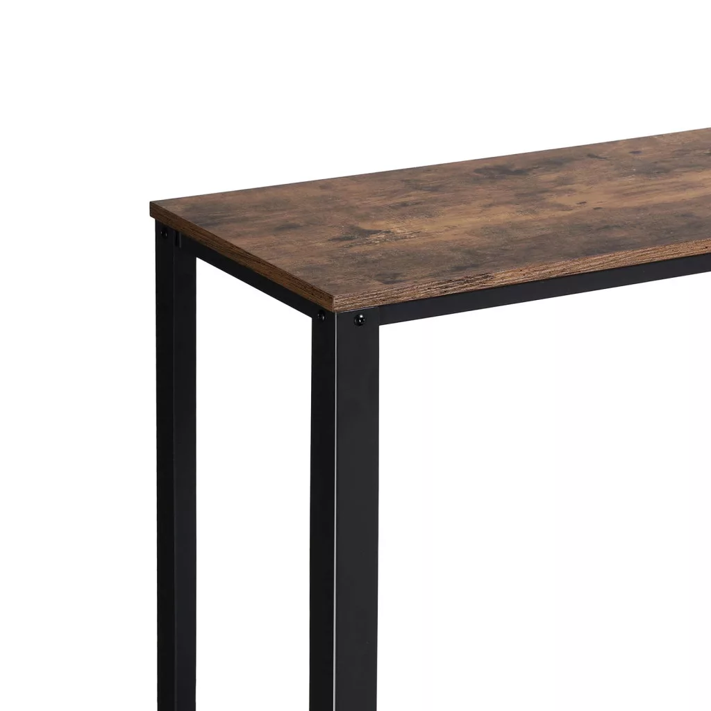 Stílusos ipari dizájnú konzolasztal rusztikus barna felülettel és fekete fém vázzal, amely tökéletes választás előszobába vagy nappaliba extra tárolóhellyel.