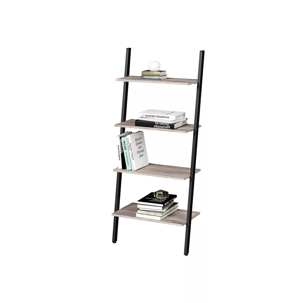 Modern ipari stílusú létrás polcrendszer, amely egyesíti a praktikumot és az esztétikumot. Stabil acélváz és szürke-bézs polclapok jellemzik, tökéletes választás könyvek, dekorációk tárolására.