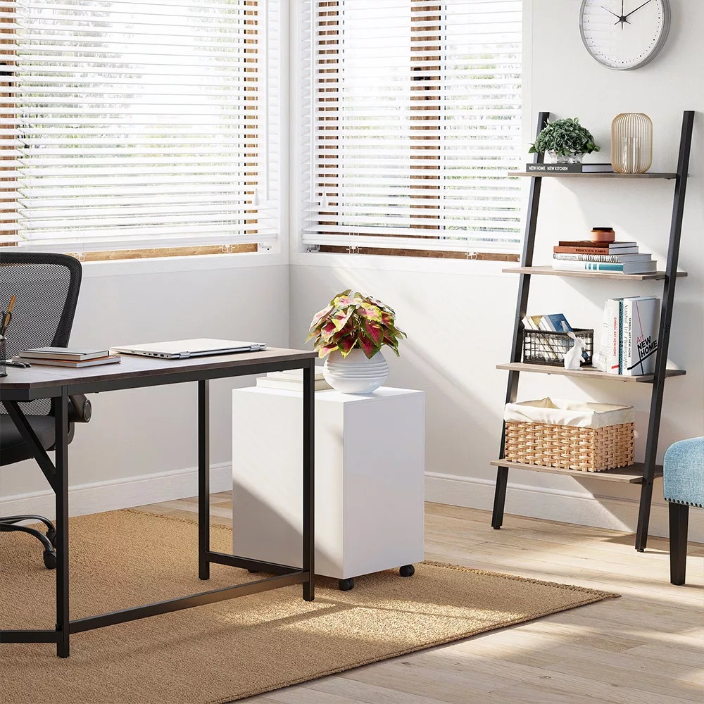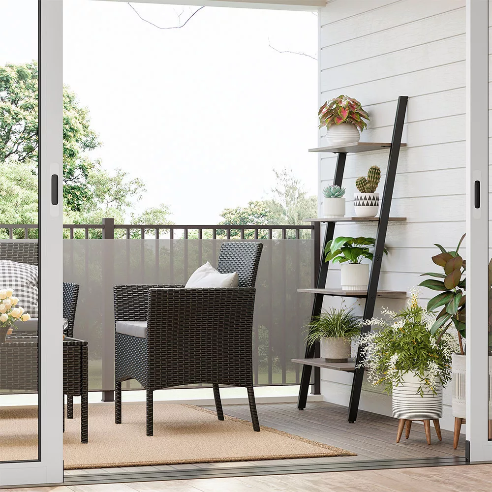 Ez a létrás polc tökéletesen ötvözi az ipari design elemeit a praktikus funkcionalitással. A ferde kialakítású, falhoz rögzíthető polcrendszer négy különböző méretű polcfelülettel rendelkezik, amelyek ideálisak könyvek, dekorációk és növények elhelyezésére.