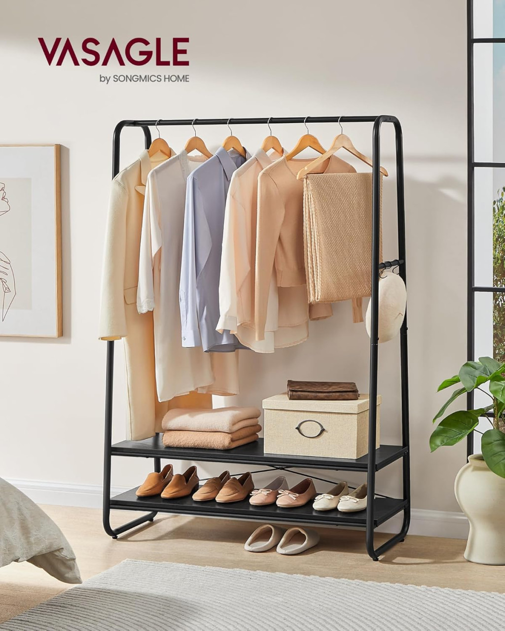 Stílusos és praktikus ruhaállvány 2 polccal és 6 S-alakú akasztóval, amely tökéletes megoldást nyújt ruhái, cipői és kiegészítői tárolására.