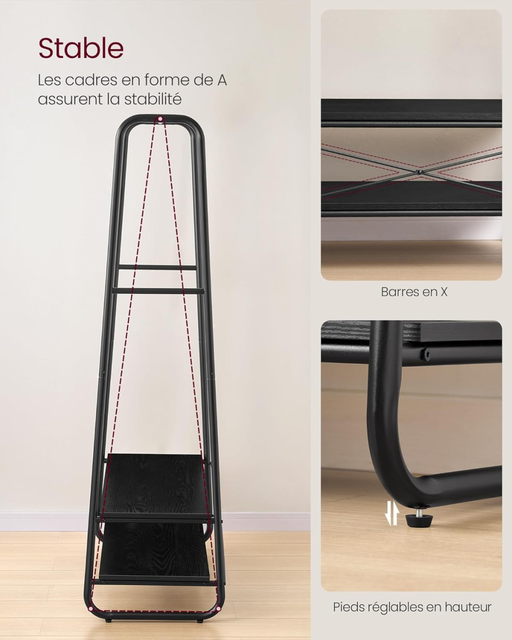 Az A-alakú kialakítás extra stabilitást nyújt, míg a 190 kg-os teherbírás lehetővé teszi nehéz télikabátok és számos egyéb ruhadarab biztonságos tárolását. A nyitott kialakítás könnyű hozzáférést biztosít minden tárolt elemhez.