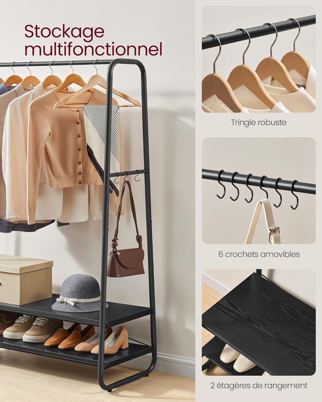 • Multifunkciós tárolás ruhaakasztó rúddal, 6 kampóval és 2 polccal