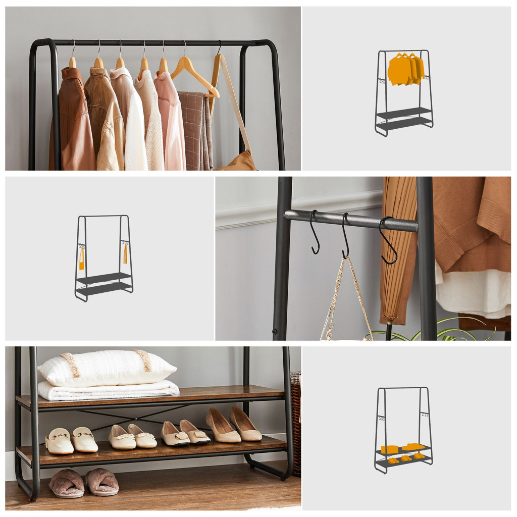 Ez az ipari stílusú ruhásállvány egyesíti a funkcionalitást és az esztétikumot. A rusztikus barna polcok és a fekete acél váz tökéletes összhangot alkotnak, miközben maximális tárolási lehetőséget biztosítanak. A teljes hosszúságú felső rúd ideális kabátok, ingek és nadrágok tárolására, míg a két polc tökéletes cipők, táskák és dobozok elhelyezésére.