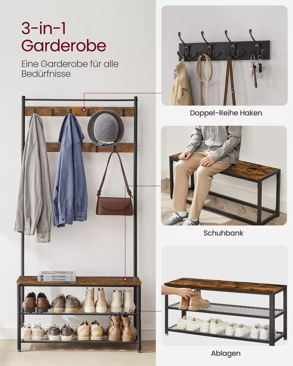 • Kompakt 3-az-1-ben megoldás: ruhaakasztó, ülőpad és cipőtároló egyben