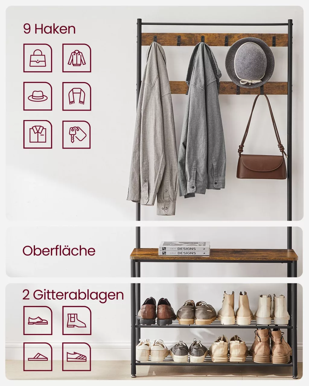 VASAGLE Ipari Stílusú 3-az-1-ben Előszobai Állvány Cipőspolccal Rusztikus Barna-Fekete