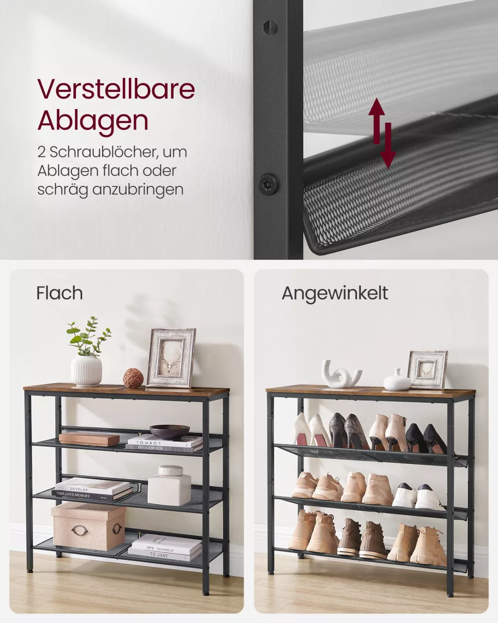 Ez a sokoldalú cipőtároló állvány tökéletes megoldást nyújt a rendezett előszobához. A rusztikus barna felületű felső polc és a három állítható dőlésszögű acél hálós polc harmonikusan ötvözi a funkcionalitást az ipari stílussal. A stabil acélváz és a minőségi faforgácslap kombinációja tartós használatot garantál.