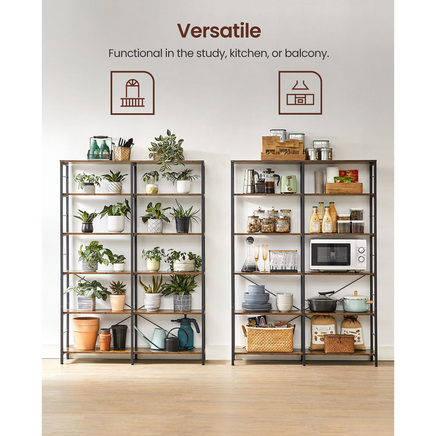 Stabil és sokoldalú ipari stílusú könyvespolc 6 tágas polcszinttel, amely tökéletes megoldást nyújt könyvek, dekorációk és mindennapi tárgyak tárolására.