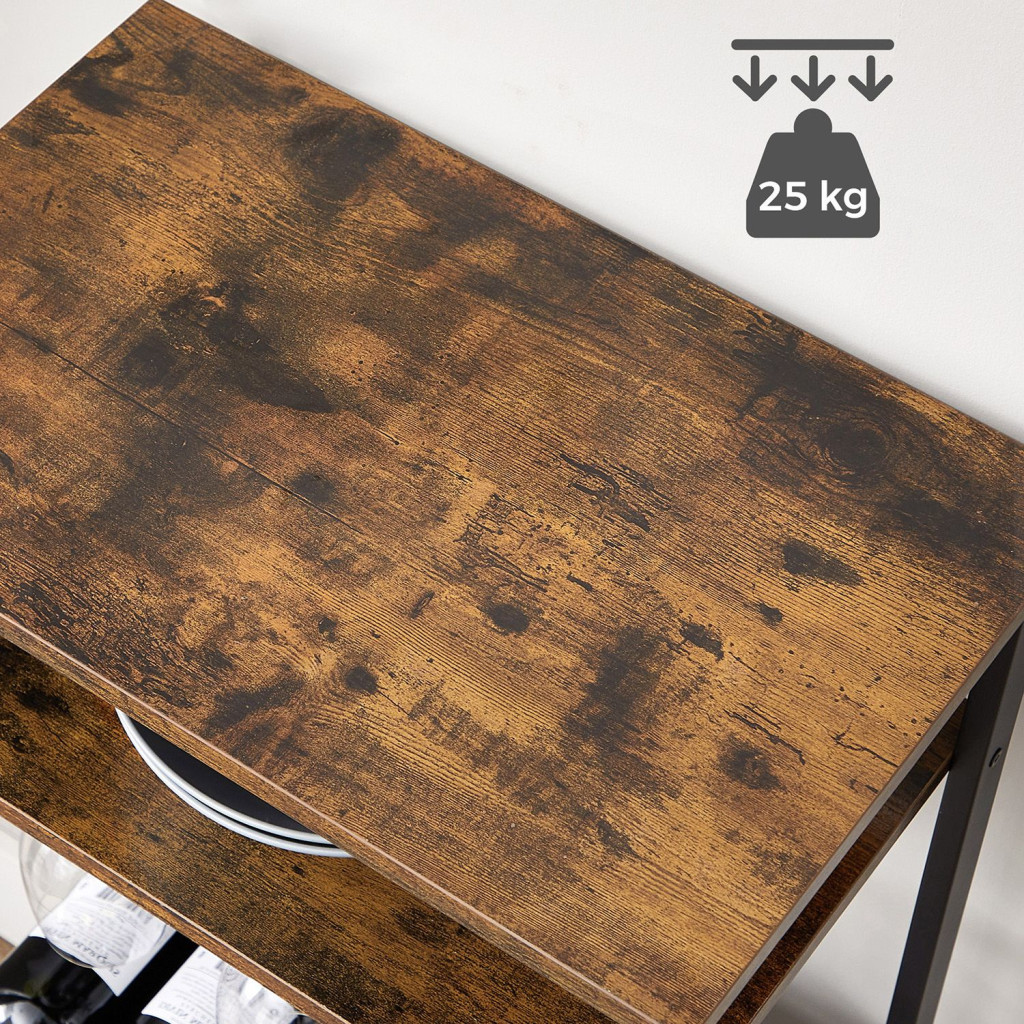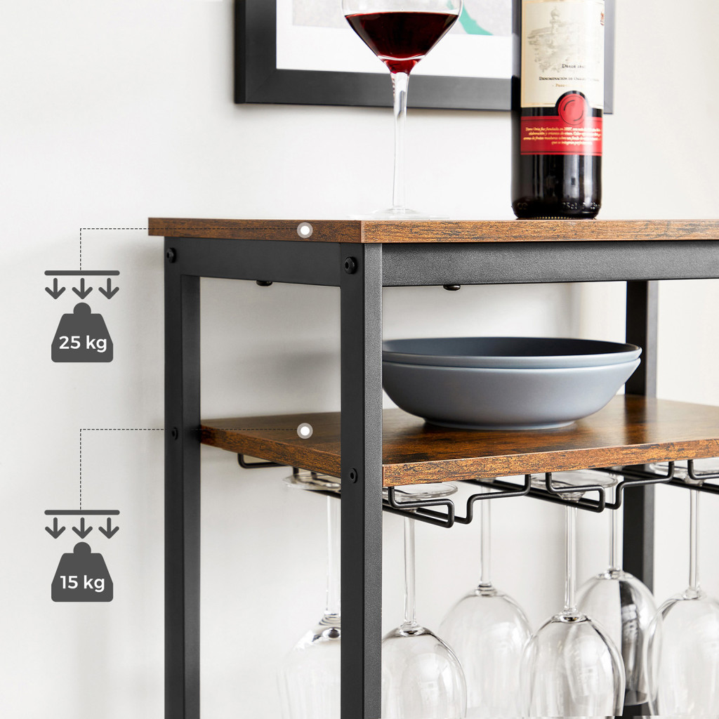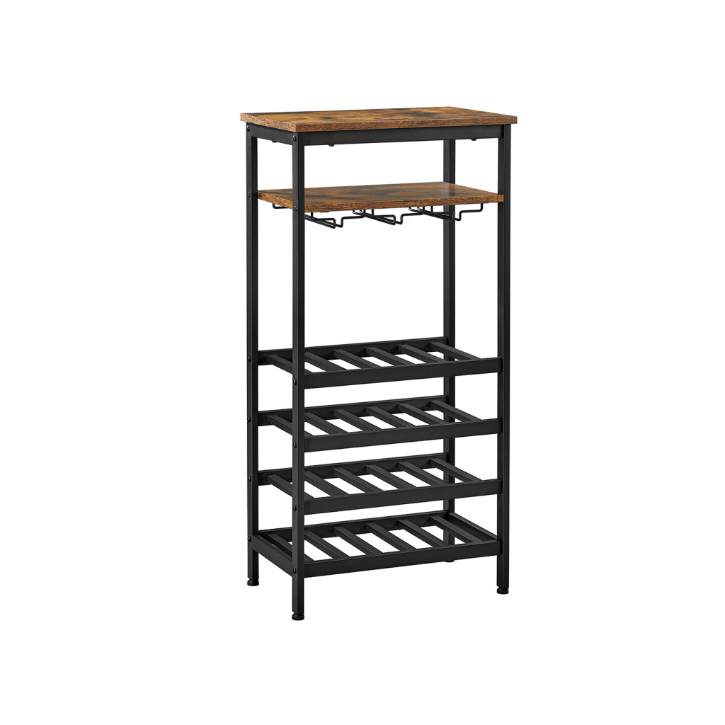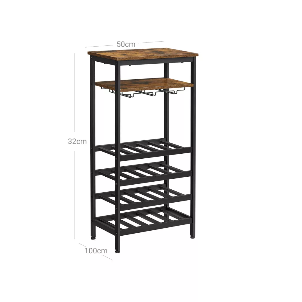 VASAGLE Ipari Stílusú Bortartó Állvány 20 Palackhoz Pohártartóval Rusztikus Barna-Fekete
