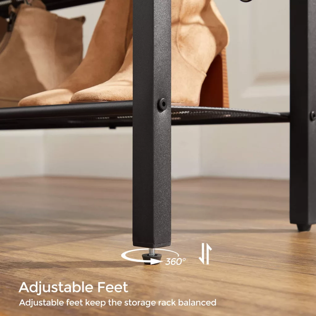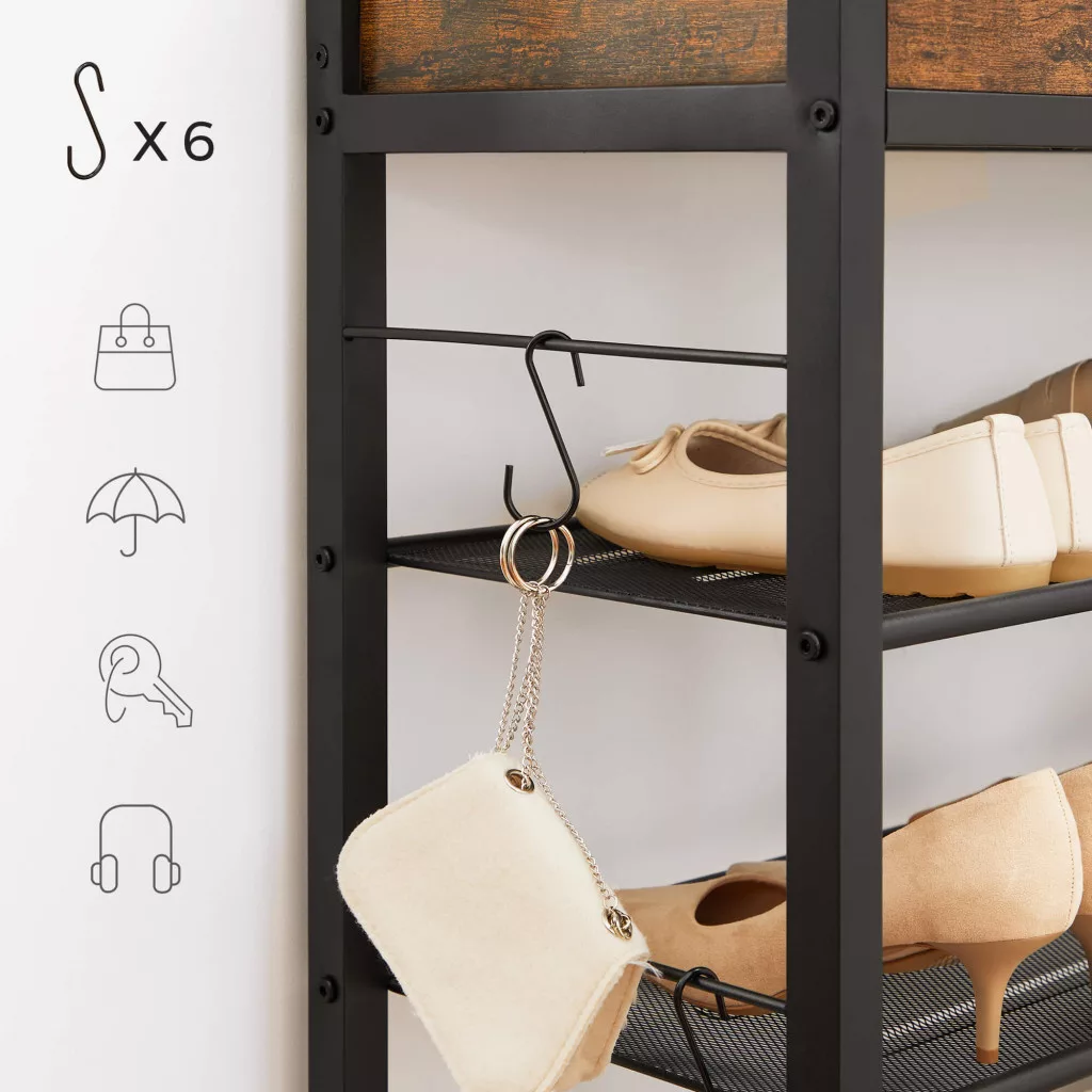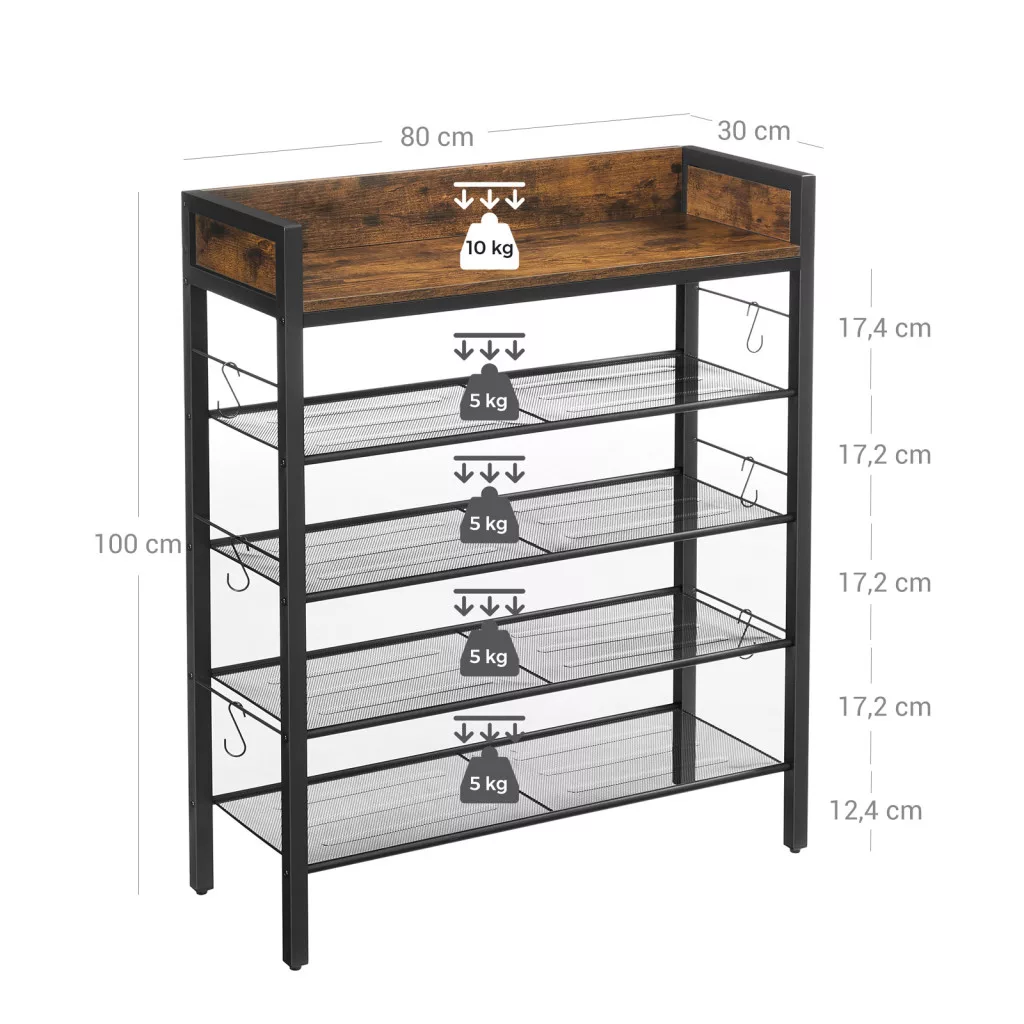 Stílusos és praktikus cipőtároló állvány 4 hálós polccal, amely akár 14 pár cipő tárolására alkalmas. A rusztikus barna és fekete színkombináció tökéletesen illeszkedik bármilyen enteriőrbe.