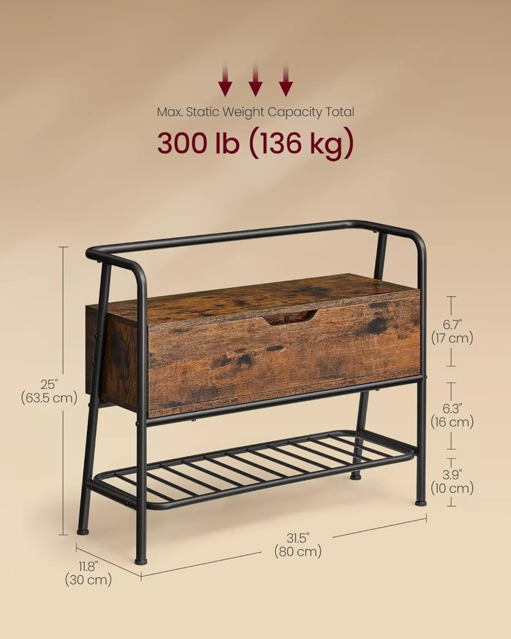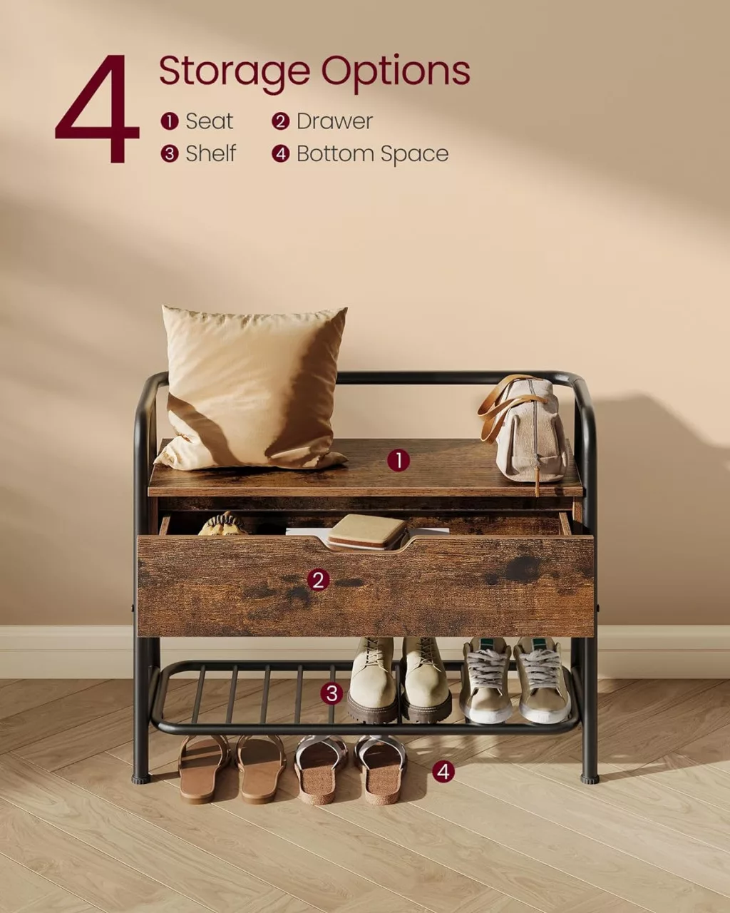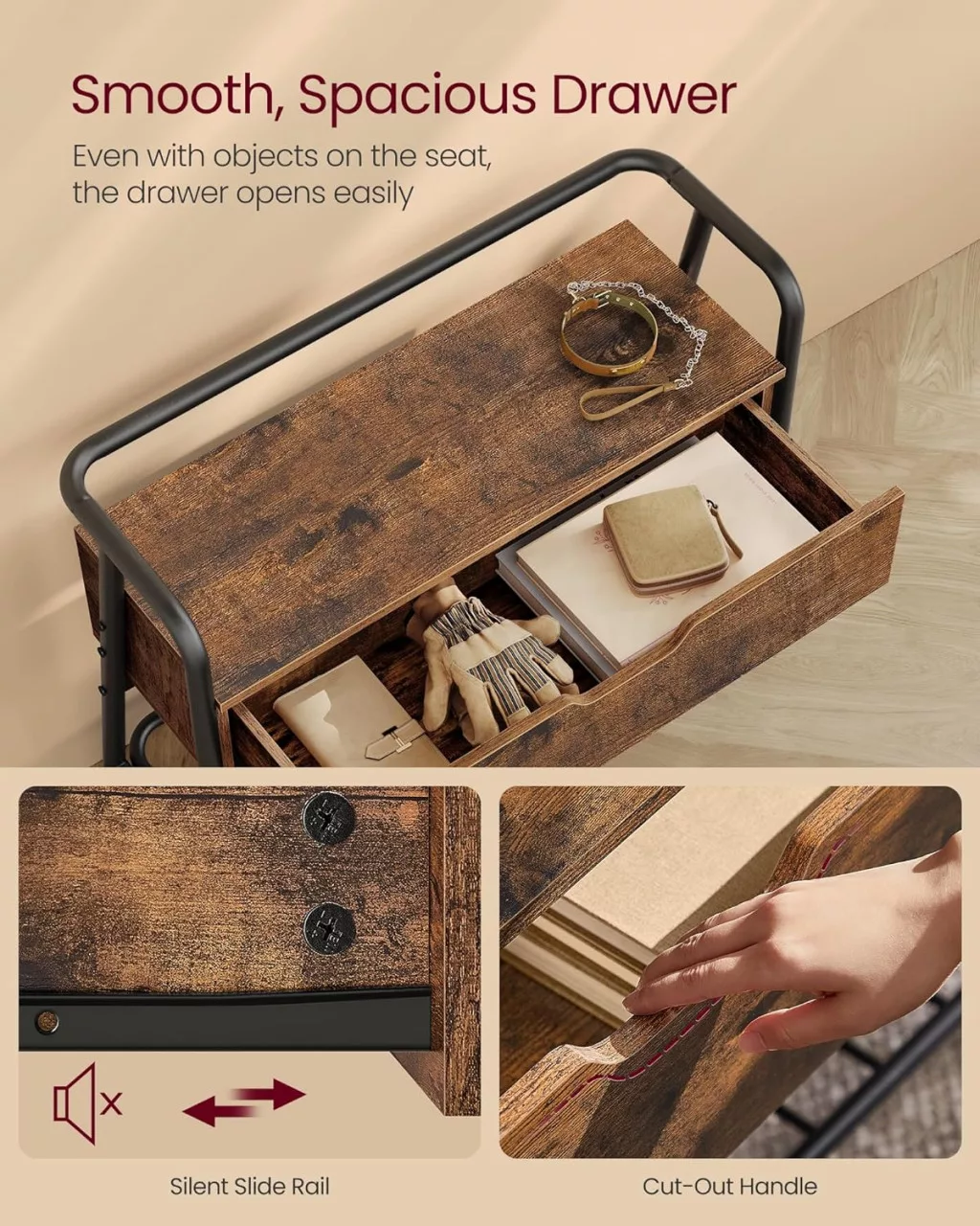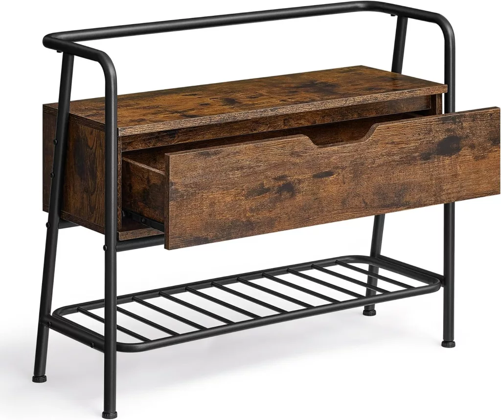 VASAGLE Ipari Stílusú Cipőtároló Pad Fiókkal Rusztikus Barna-Fekete
