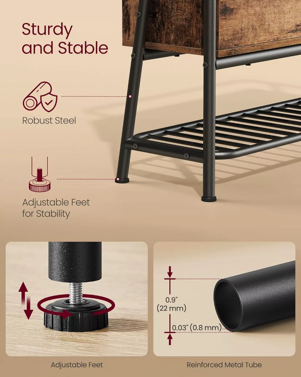Ez az ipari stílusú cipőtároló pad egyesíti a praktikumot és az esztétikumot. A rusztikus barna faborítás és a fekete acélváz kombinációja modern ipari megjelenést kölcsönöz, miközben maximális funkcionalitást biztosít. A pad három különböző tárolószinttel rendelkezik: egy alsó polccal, egy középső cipőtartó résszel és egy tágas fiókkal.