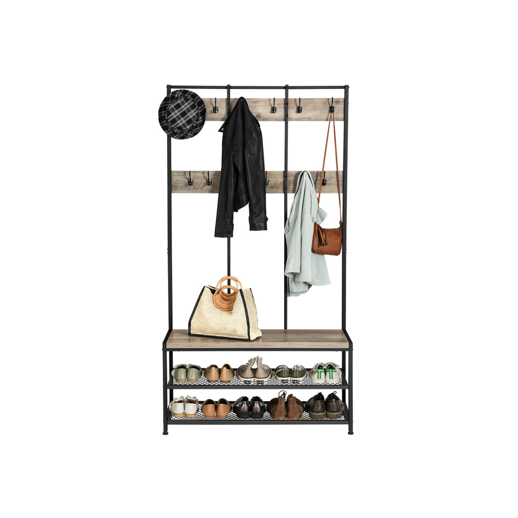 VASAGLE Ipari Stílusú Előszobafal 12 Akasztóval és Cipőspaddal Greige-Fekete