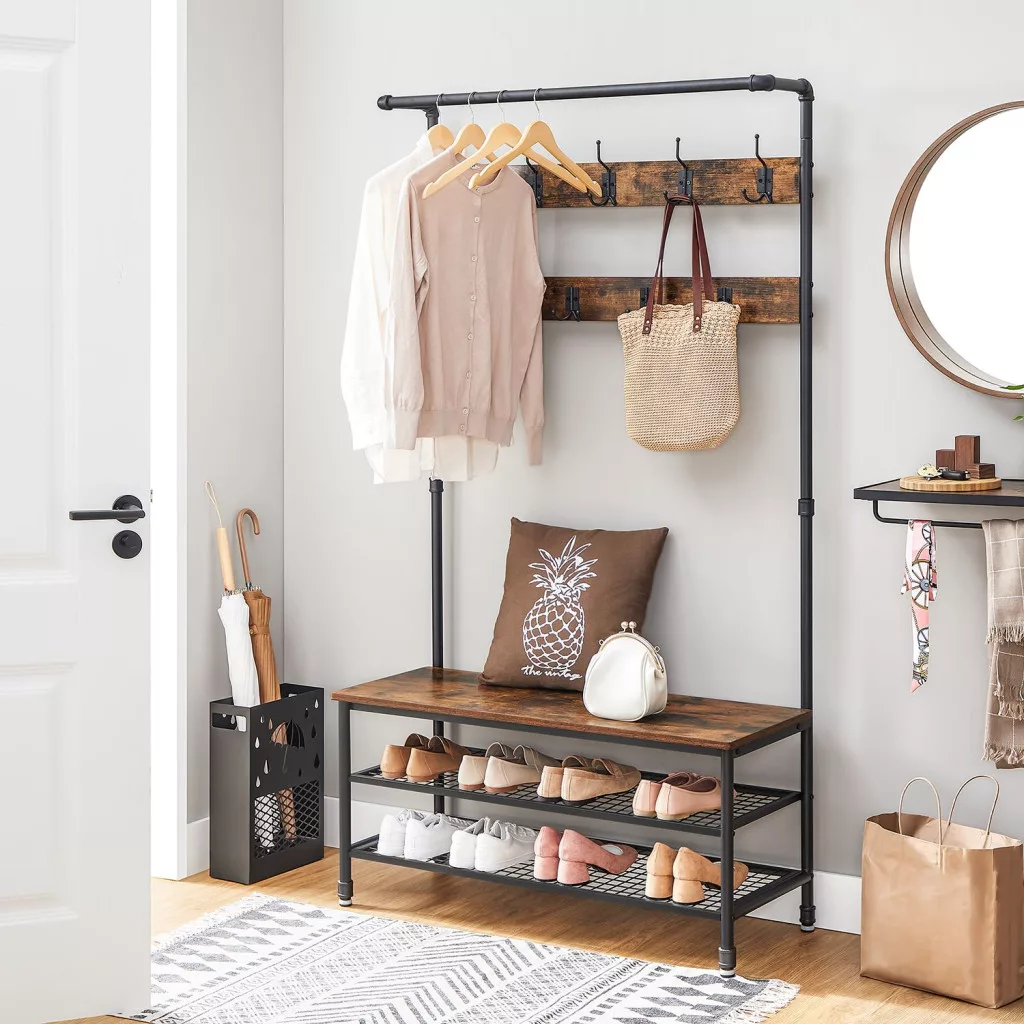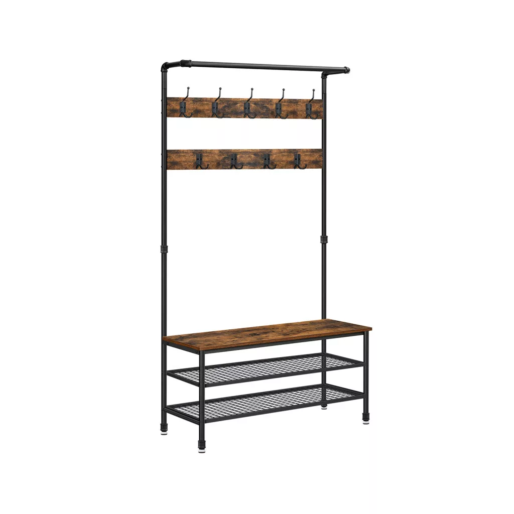 VASAGLE Ipari Stílusú Előszobafal Cipőspolccal és 9 Akasztóval Rusztikus Barna-Fekete