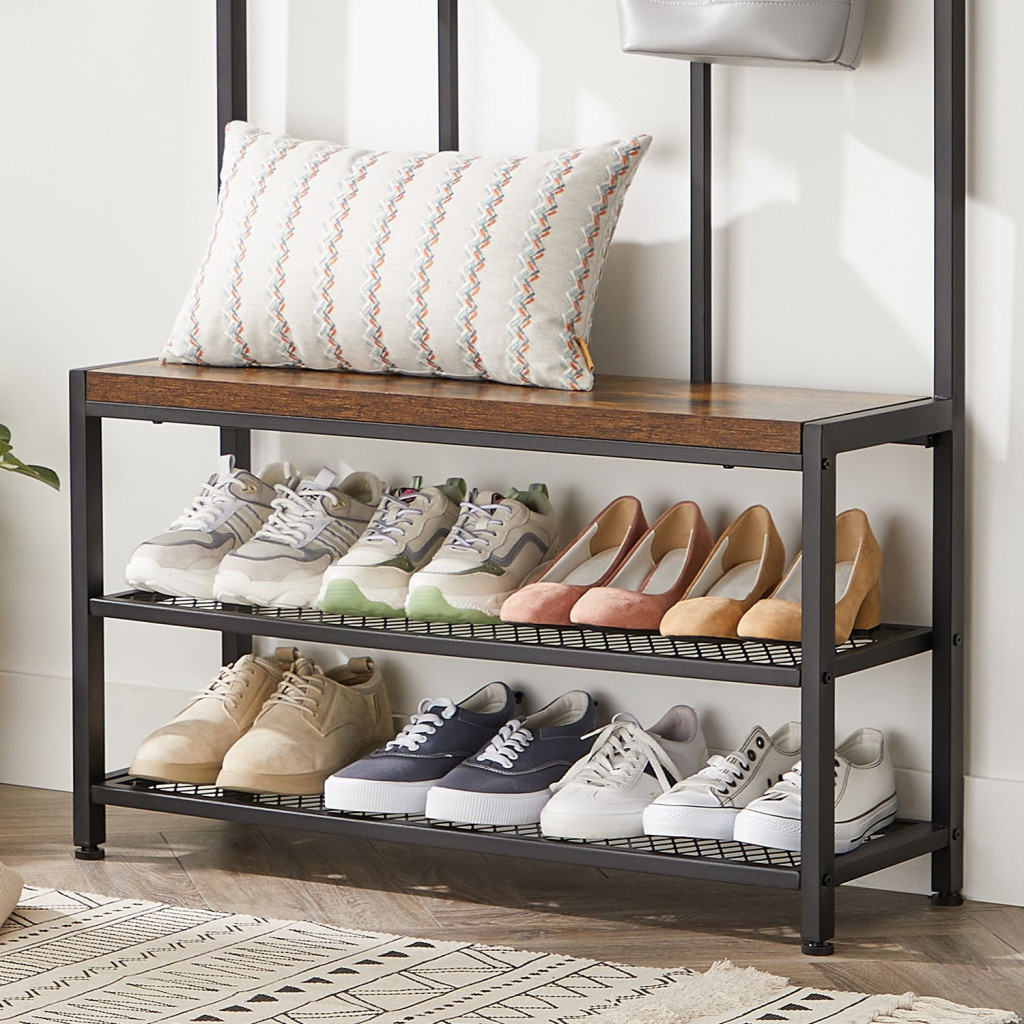 VASAGLE Ipari Stílusú Előszobai Állvány Rusztikus Barna-Fekete Fém Vázas Cipőspolccal