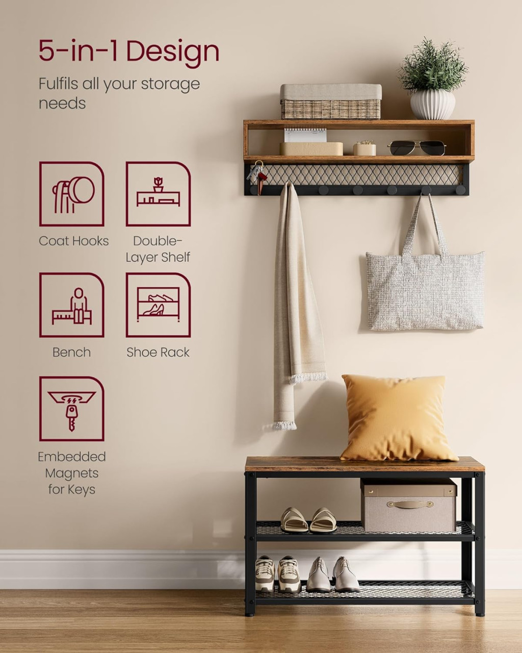 A szett két fő elemből áll: egy kétszintes cipőspadból és egy többfunkciós falra szerelhető fogasból. A fogas felső polca dekorációk és mindennapi tárgyak tárolására szolgál, míg a 7 akasztó és a beépített mágnesek praktikus tárolást biztosítanak kabátok, táskák és kulcsok számára.