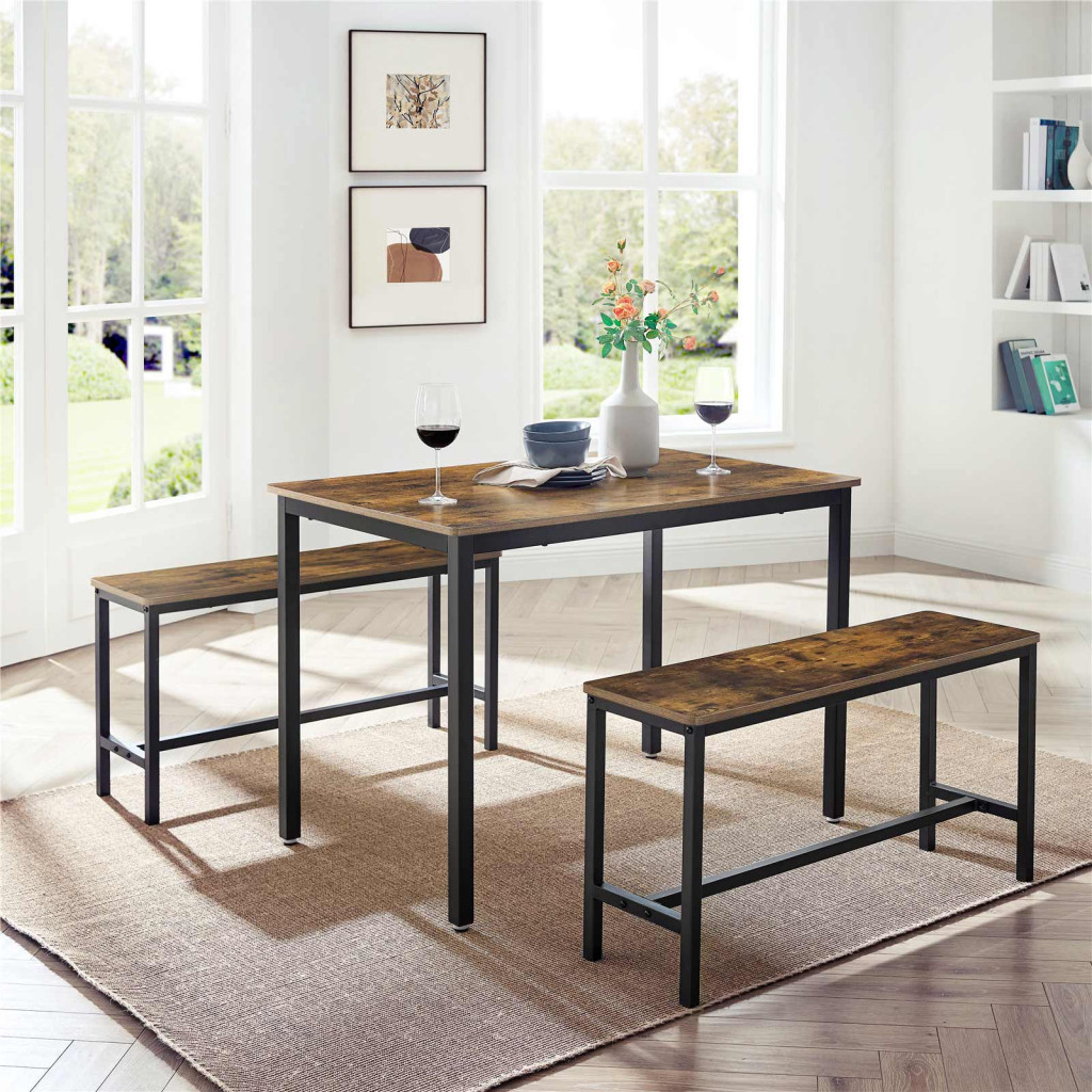 Modern, ipari stílusú 3 részes étkező garnitúra egy asztallal és két paddal, amely tökéletes megoldást nyújt kis terekbe. A rusztikus barna felületek és fekete acél váz kombinációja időtlen designt kölcsönöz.