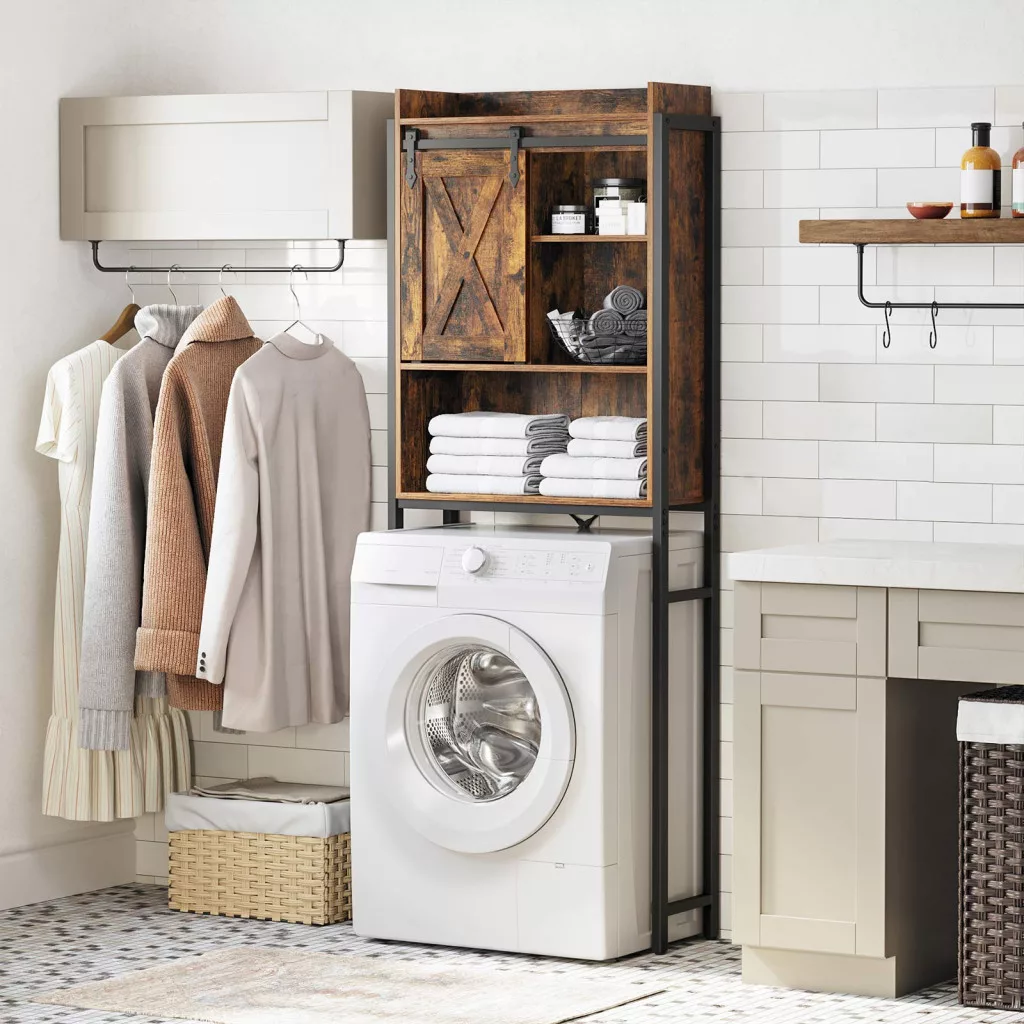 Helytakarékos fürdőszobai állvány 3 nyitott polccal és egy kisméretű szekrénnyel, amely tökéletesen illeszkedik a WC vagy mosógép fölé. Az ipari dizájn és a rusztikus fa megjelenés stílusos tárolási megoldást kínál.