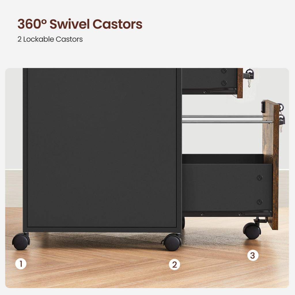 VASAGLE Ipari Stílusú Görgős Irattartó Szekrény Zárható Fiókokkal Rusztikus Barna-Fekete