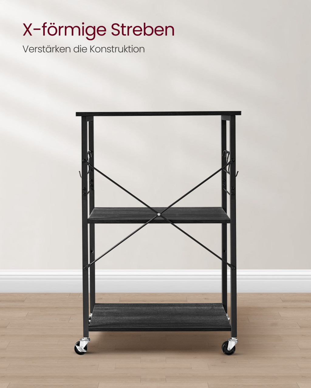A robusztus acélváz és a minőségi faforgácslap polcok stabil alapot biztosítanak, míg a görgők révén könnyedén mozgatható. Az X-alakú merevítés extra stabilitást ad, így biztonságosan tárolhatja rajta konyhai készülékeit.