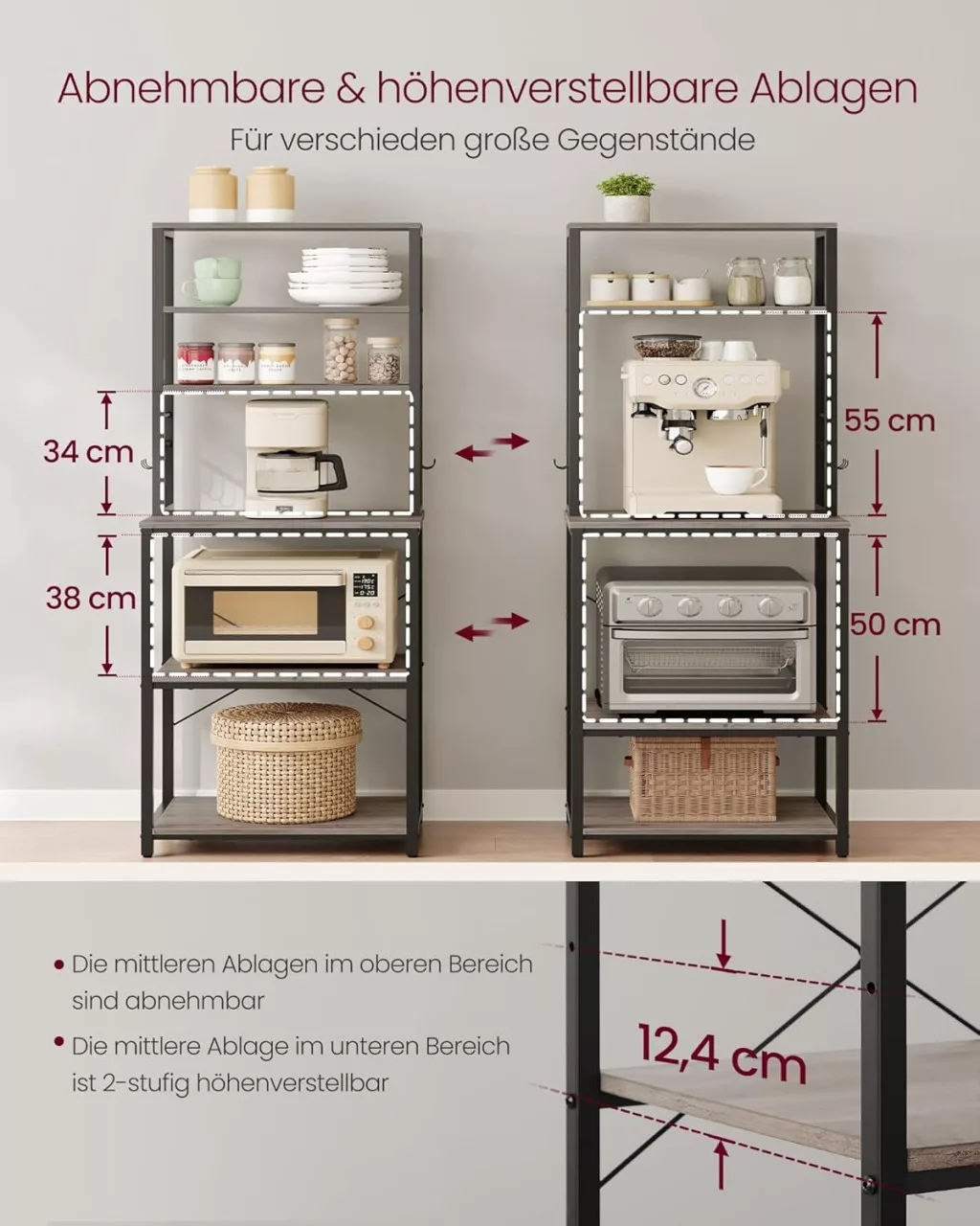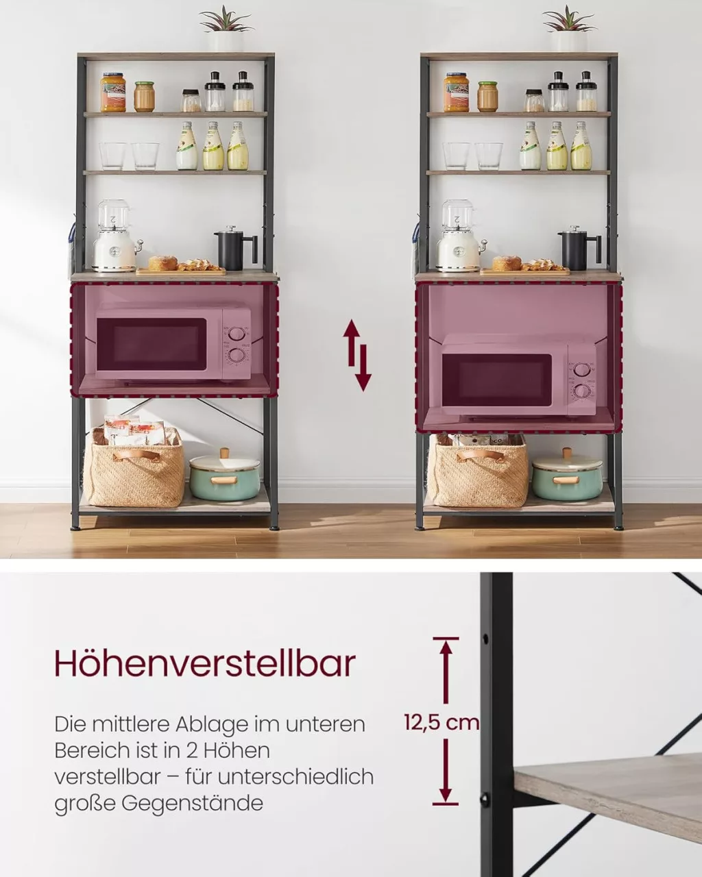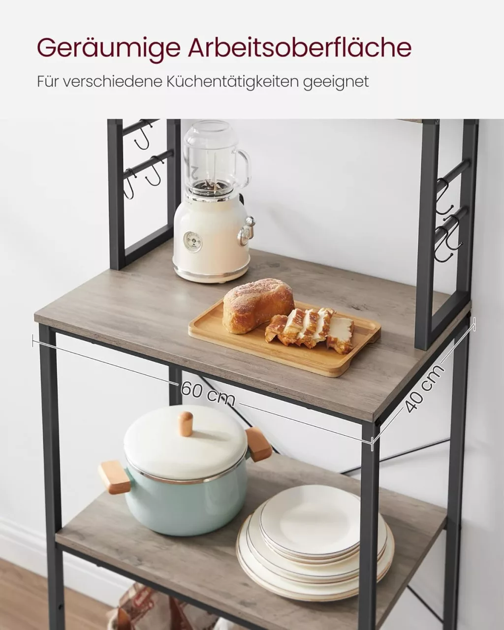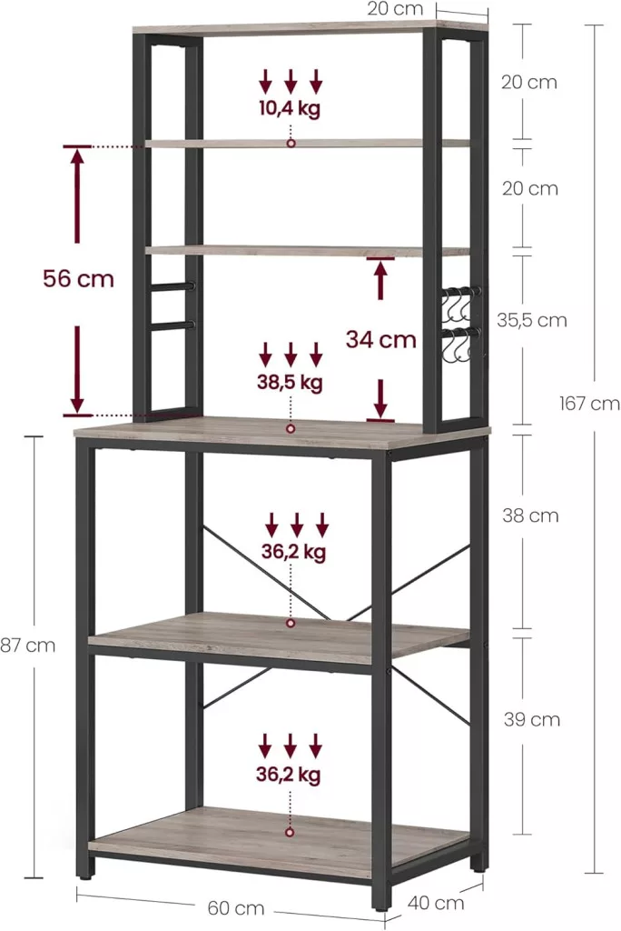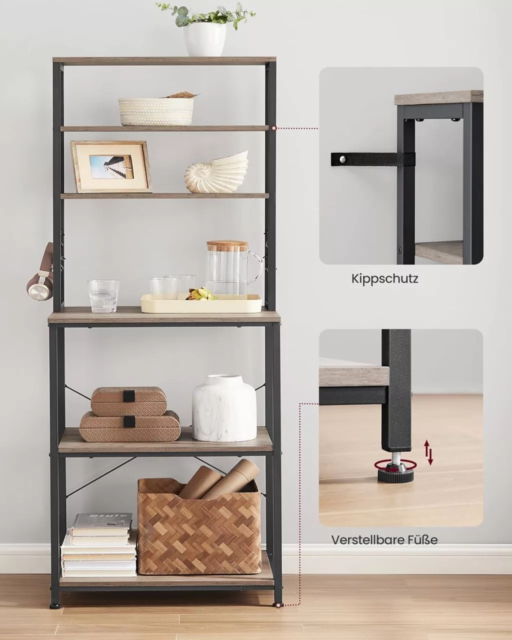 Az állvány 6 polca és 6 praktikus akasztója maximális tárolóhelyet biztosít még kis konyhákban is. A állítható lábaknak és a falhoz rögzítő elemnek köszönhetően biztonságosan használható, miközben a greige-fekete színkombináció modern megjelenést kölcsönöz.