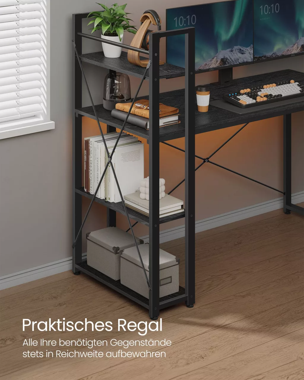 Modern, ipari stílusú számítógépasztal rugalmasan elhelyezhető tárolópolcokkal, amely tökéletes választás otthoni irodába vagy gaming setuphoz.