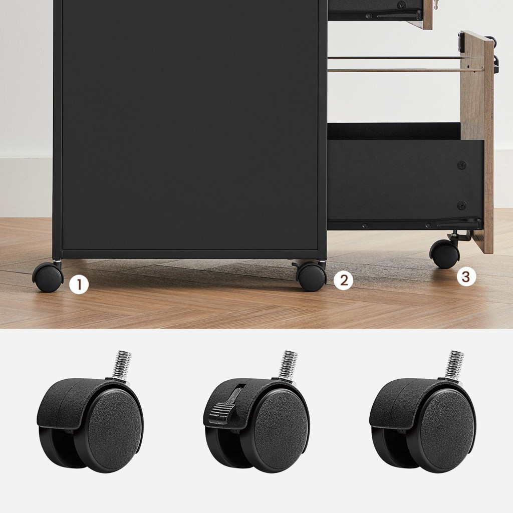 Ez a VASAGLE görgős irattartó szekrény tökéletesen ötvözi a funkcionalitást és a stílust. A fa hatású és fekete acél kombinációja modern ipari megjelenést kölcsönöz, míg a praktikus kialakítás maximális rendszerezhetőséget biztosít. A nyitott polc, valamint két zárható fiók ideális megoldást nyújt mind az irodai dokumentumok, mind a személyes tárgyak tárolására.