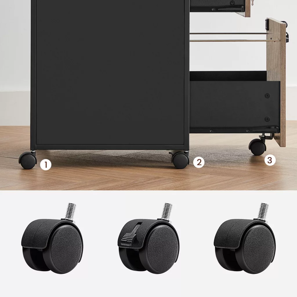 Modern, ipari stílusú görgős irattartó szekrény zárható fiókokkal, nyitott tárolórésszel és univerzális kerekekkel a maximális mobilitásért.