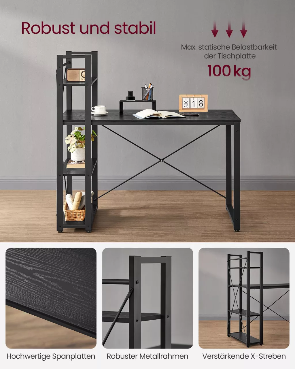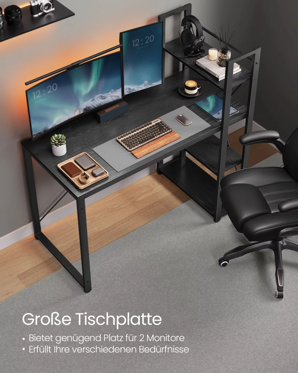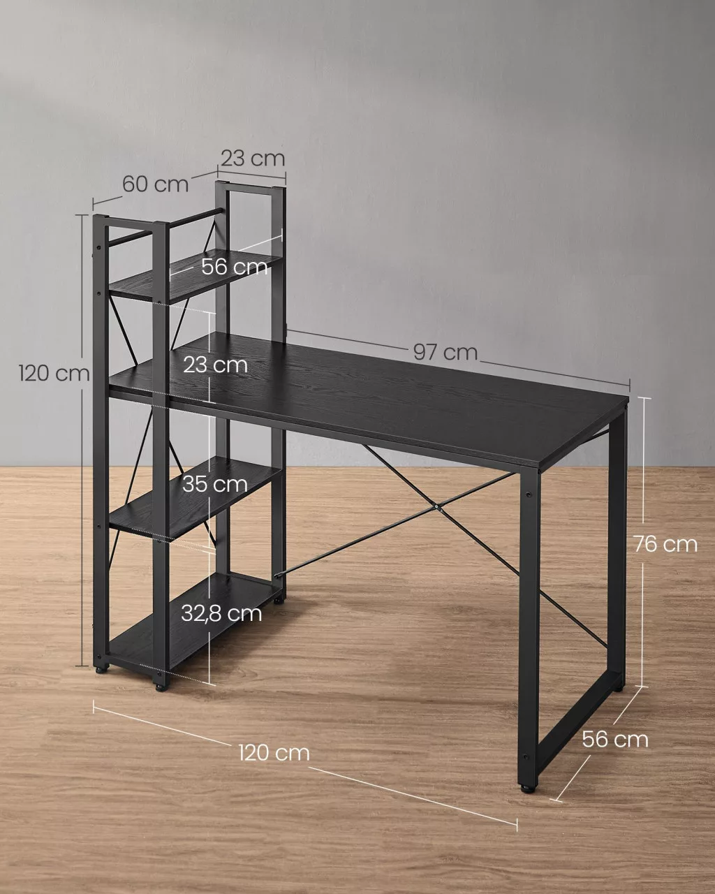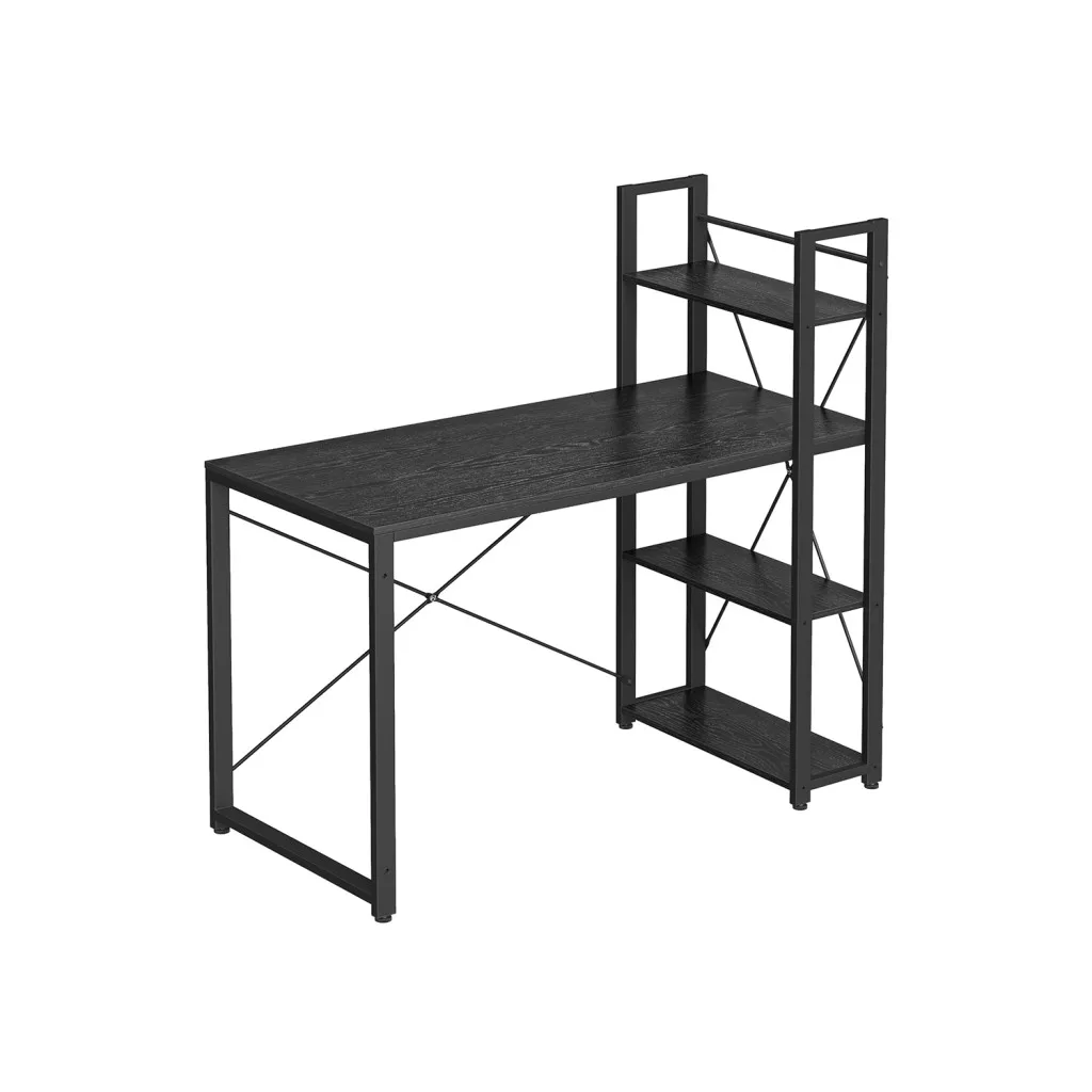 VASAGLE Ipari Számítógépasztal Tárolópolcokkal 120 cm Ébenfekete