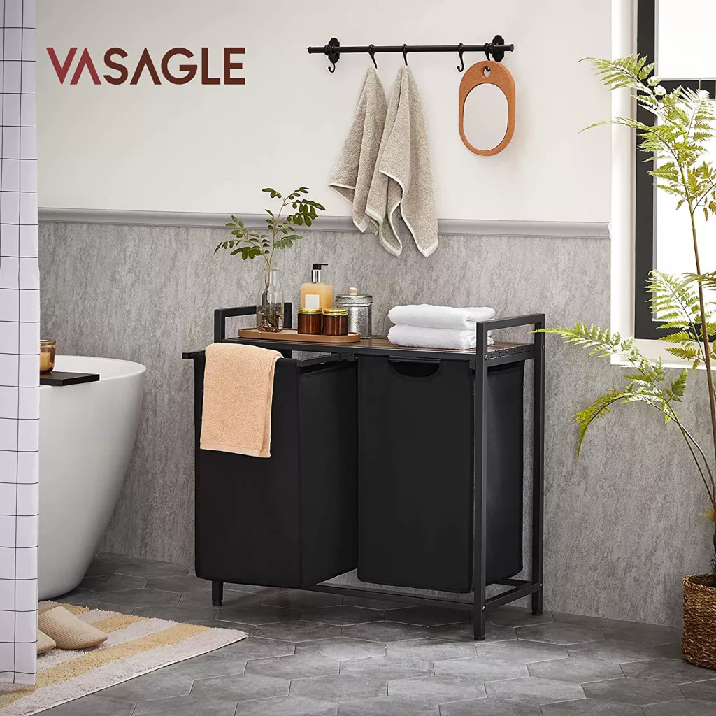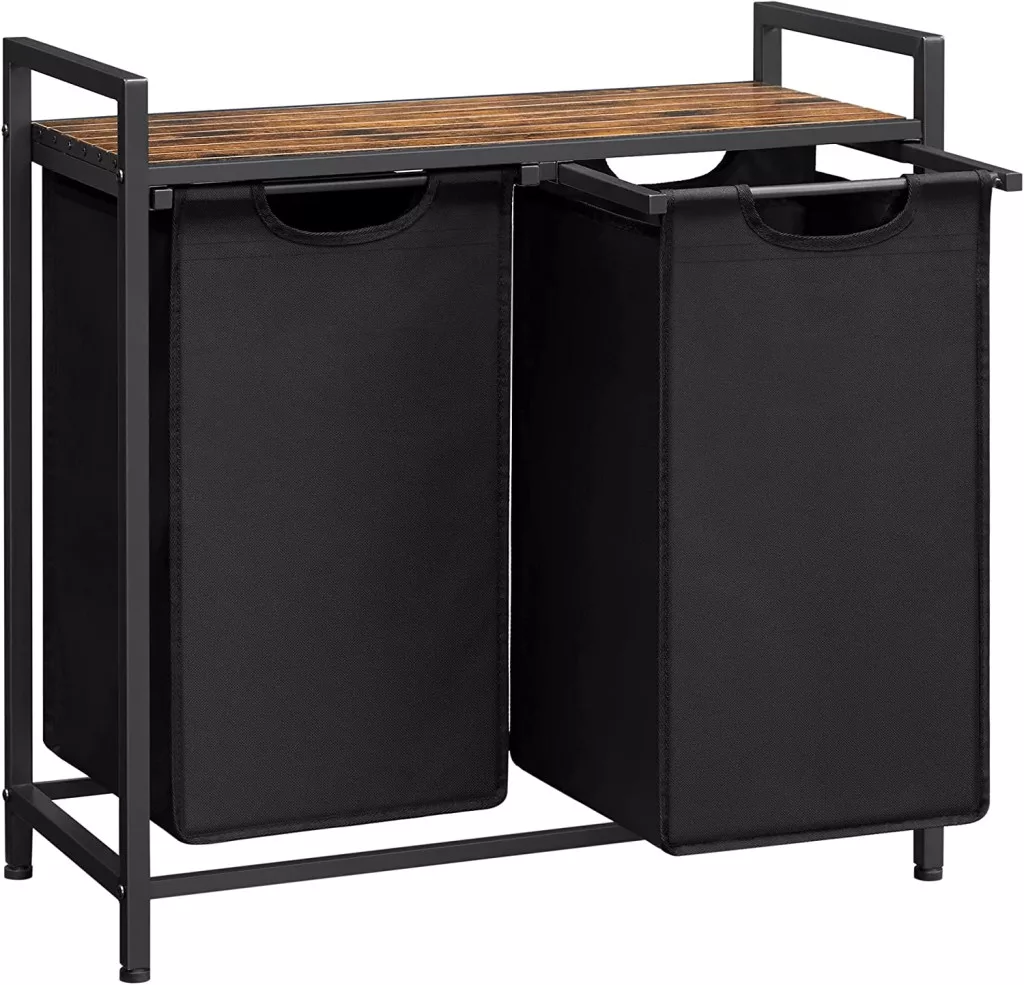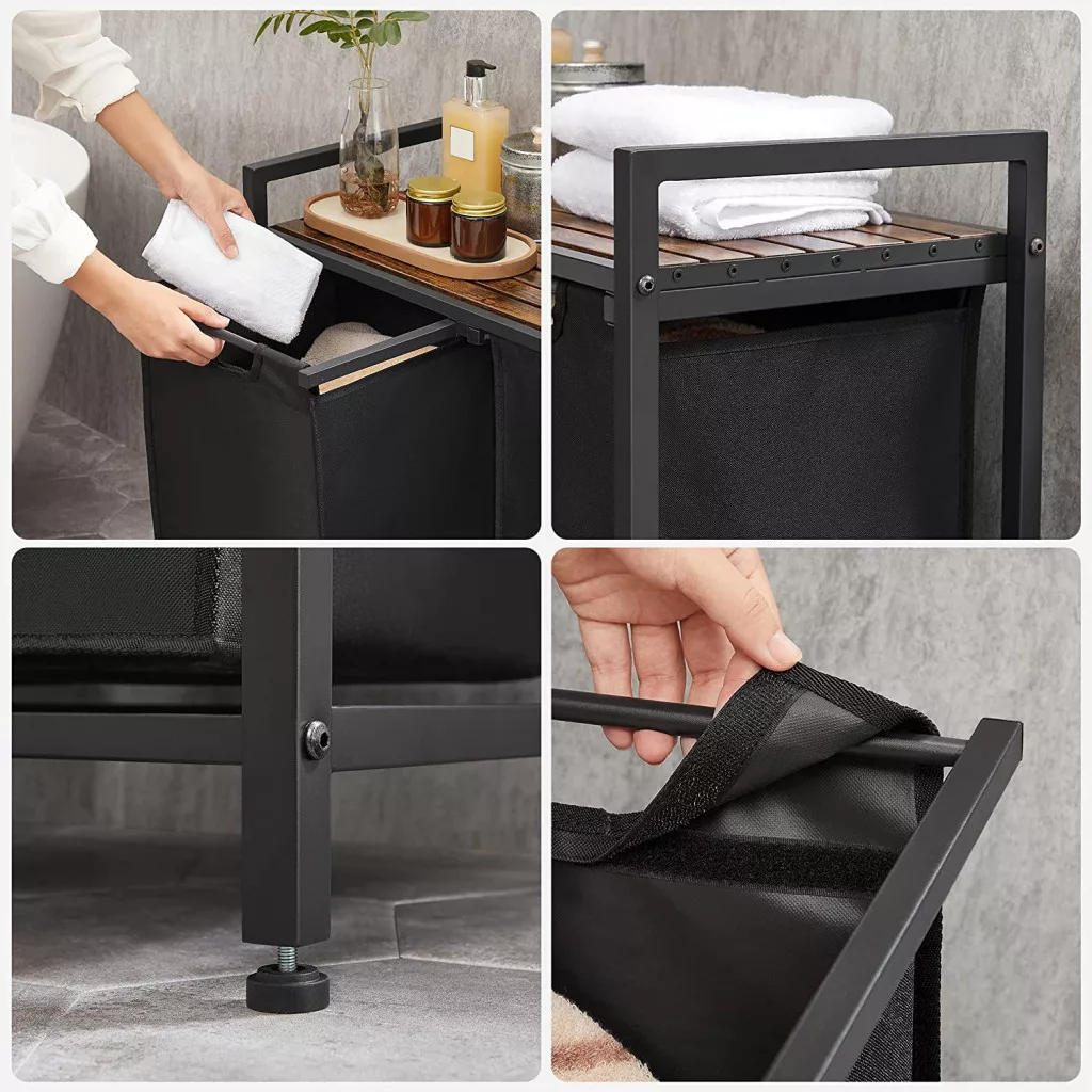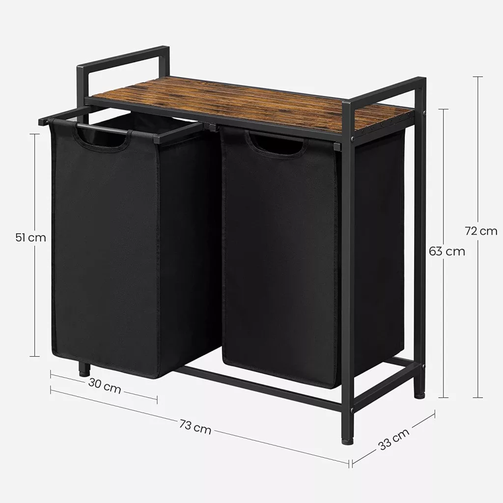 Ez a modern ipari stílusú szennyestartó állvány tökéletes megoldást nyújt a fürdőszoba vagy mosókonyha rendszerezéséhez. A két kivehető, nagy kapacitású Oxford szövet zsák lehetővé teszi a ruhák színek vagy típusok szerinti szétválogatását, míg a felső polc extra tárolóhelyet biztosít tisztálkodási szereknek és mosószereknek.