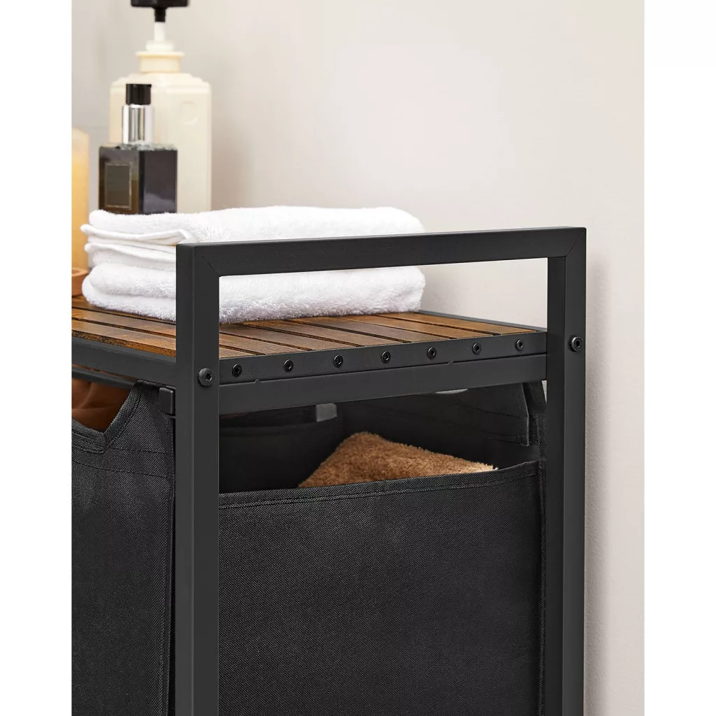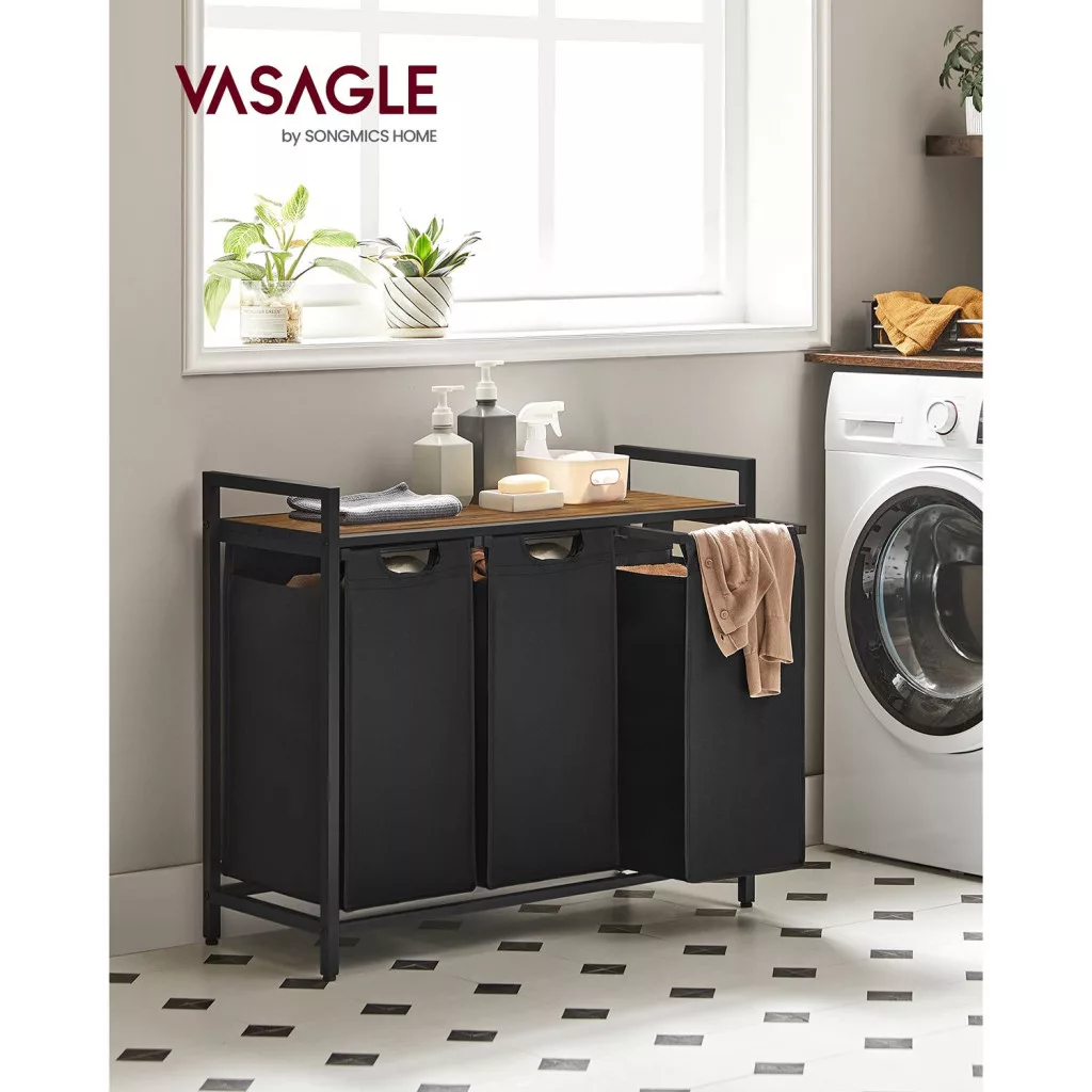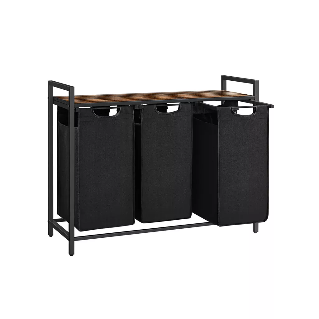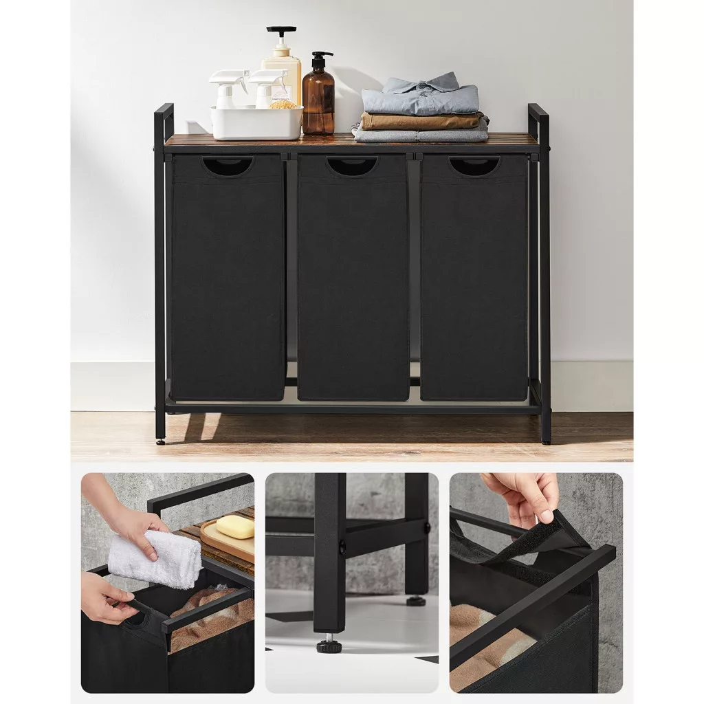 VASAGLE Ipari Szennyestartó Szekrény 3 Kivehető Zsákkal és Tárolópolccal Rusztikus Barna-Fekete
