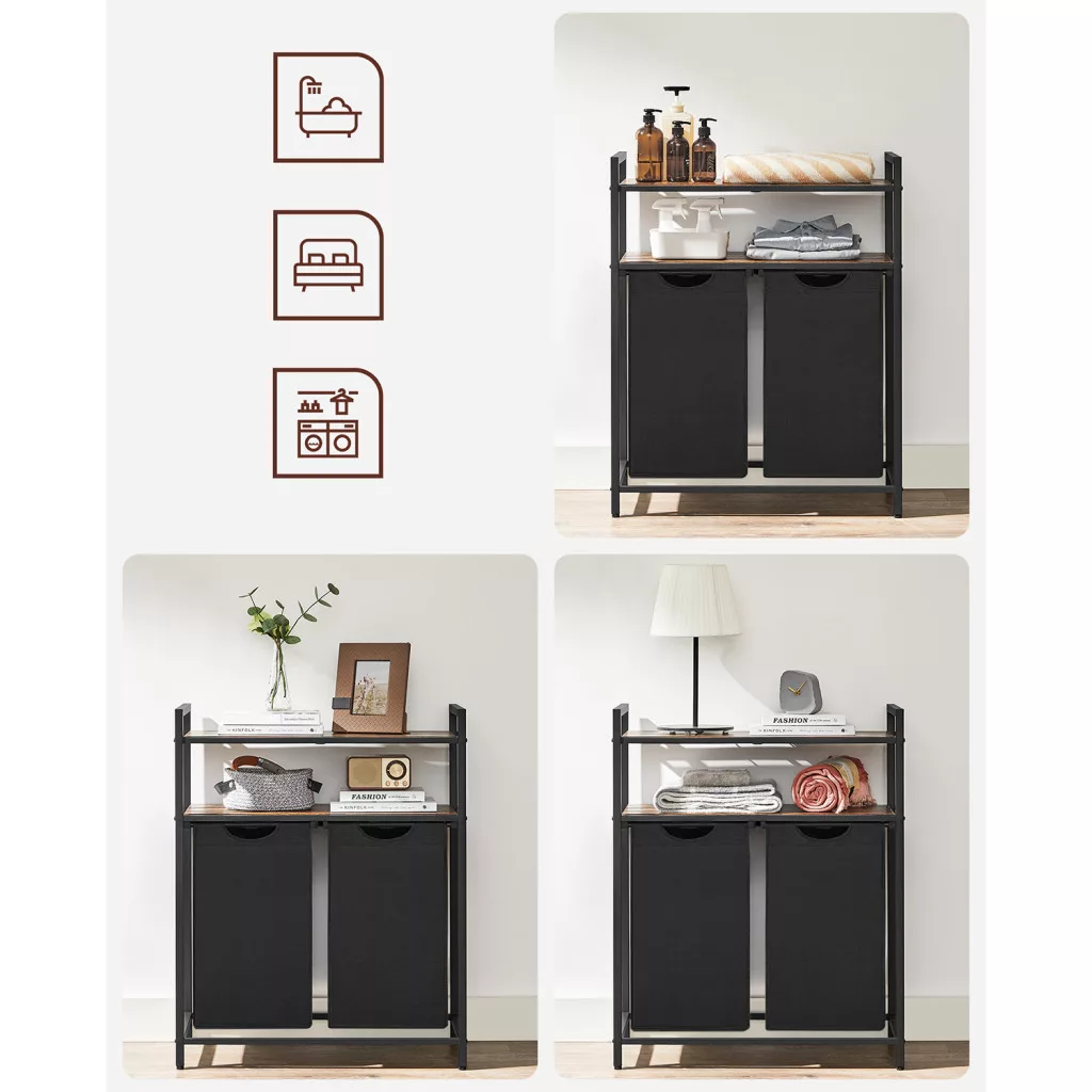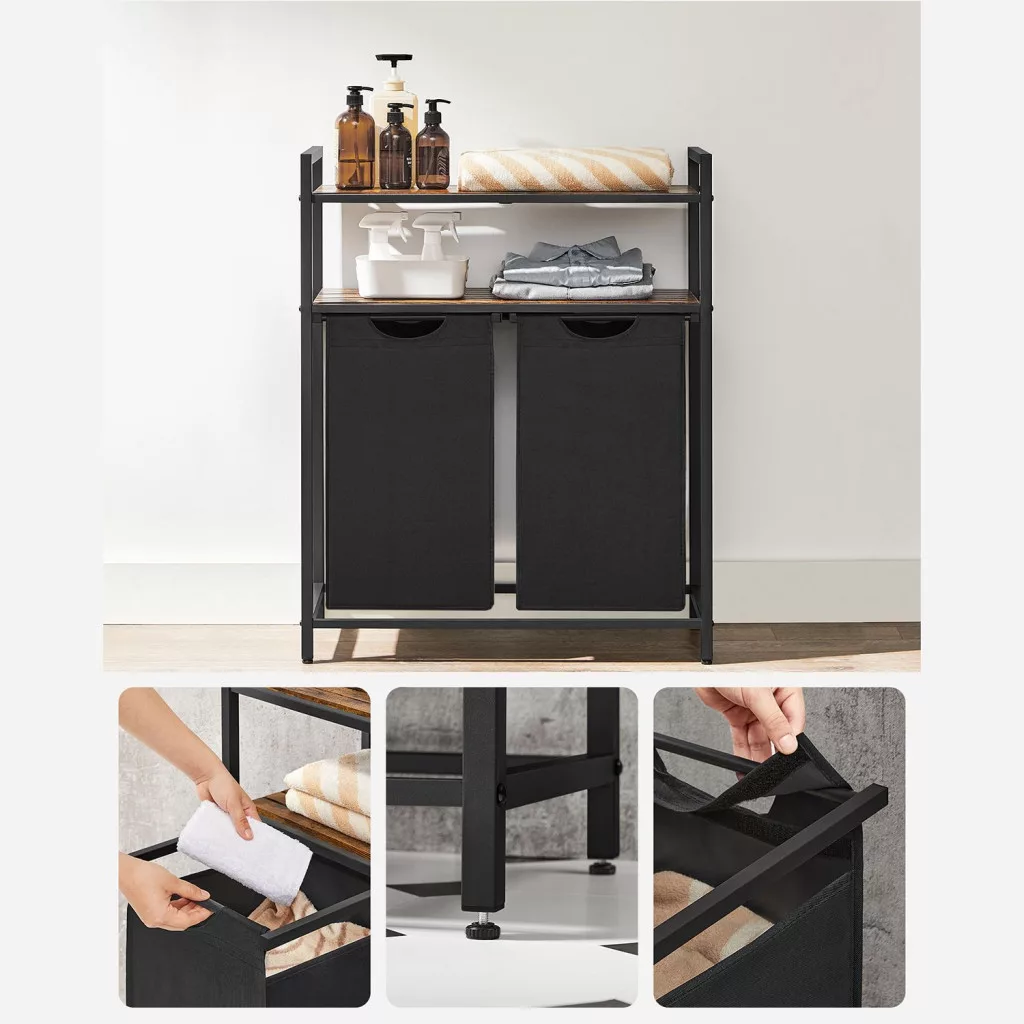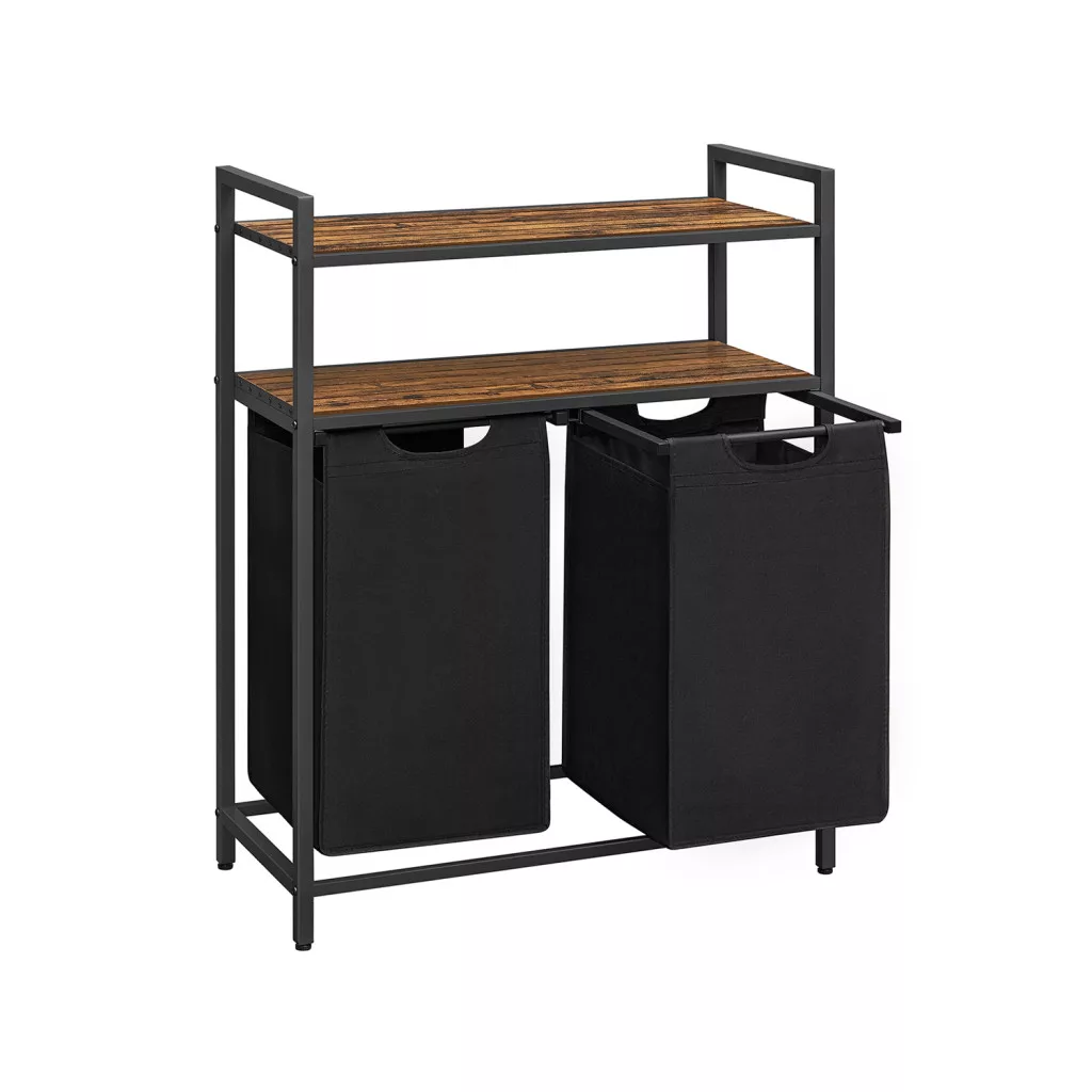A robusztus acélváz és a minőségi MDF polcok stabil szerkezetet biztosítanak, a rusztikus barna felületek pedig elegáns megjelenést kölcsönöznek a bútornak. A kihúzható és kivehető tárolózsákok megkönnyítik a ruhák mosógéphez szállítását.