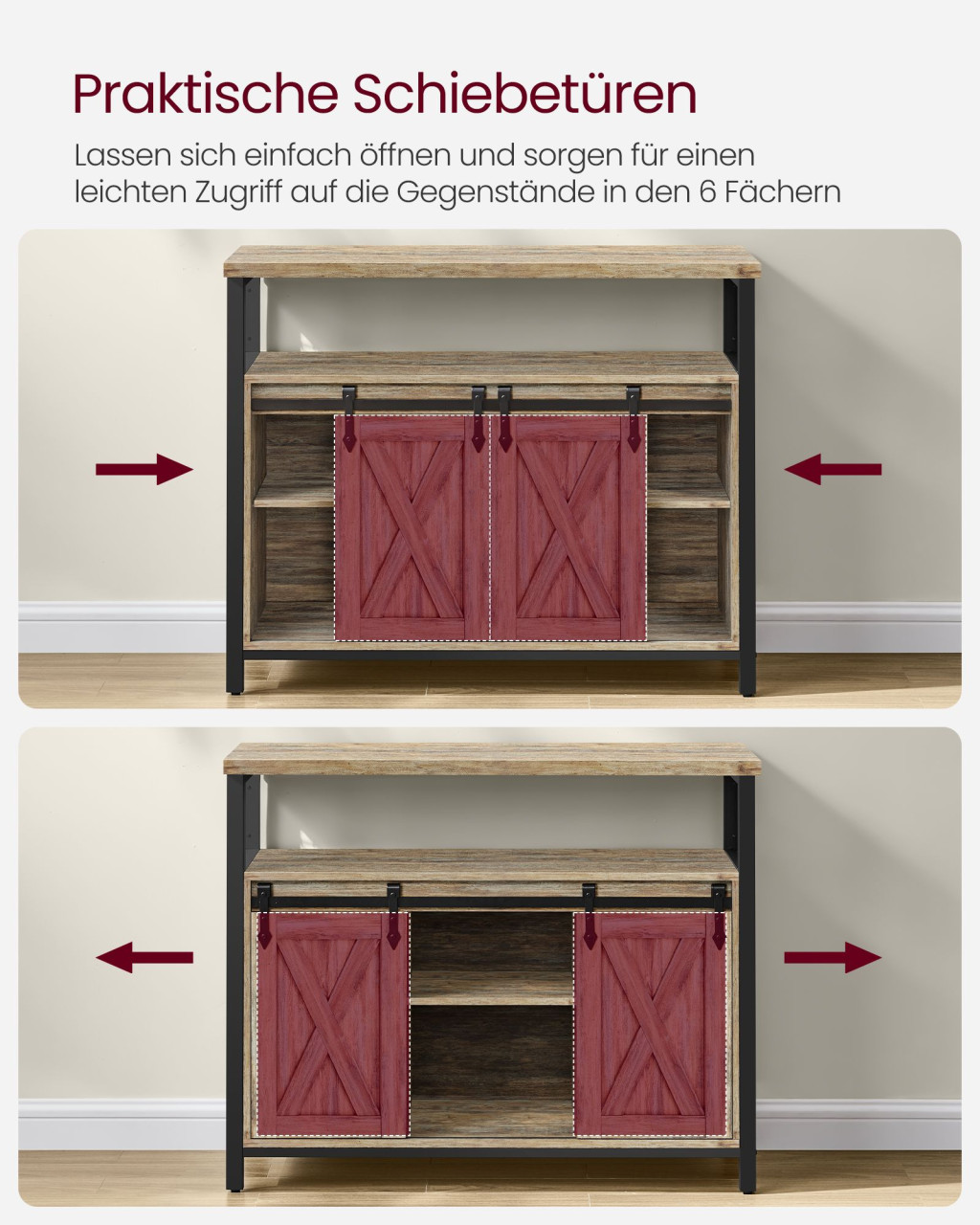Modern ipari stílusú tárolószekrény 6 rekesszel és 2 csúszó ajtóval, amely tökéletes megoldást nyújt a konyhai vagy nappali tárolási igényekhez.